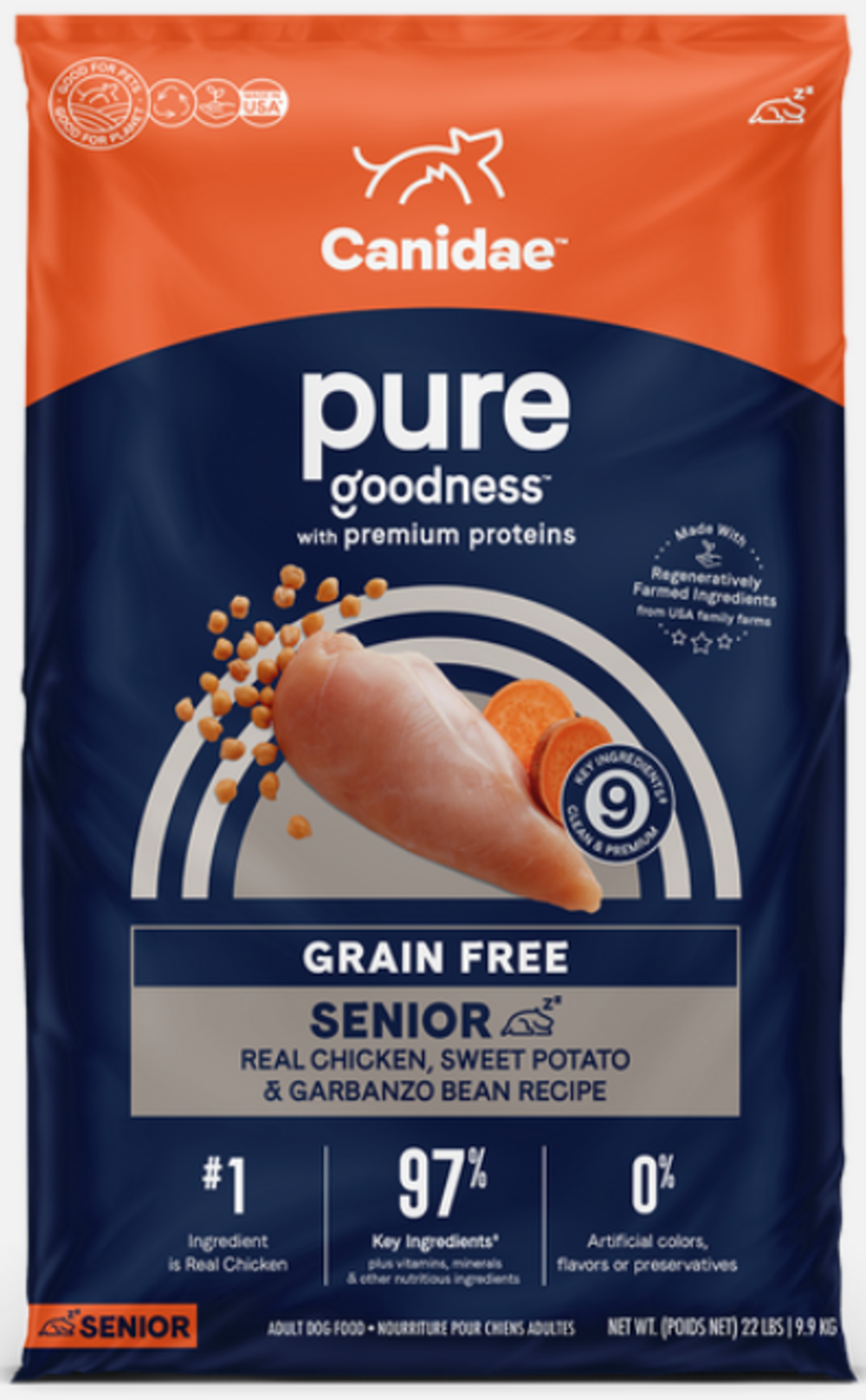 Grain-free diets are often suitable for seniors with grain sensitivities. Canidae PURE Chicken & Sweet Potato Recipe provides clean protein without common allergens like corn, wheat, or soy.
