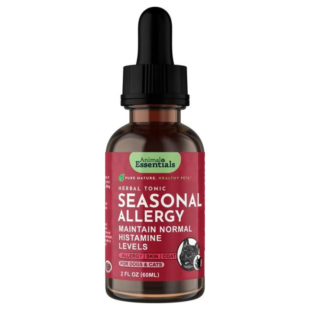 Animal Essentials Seasonal Allergy Herbal Formula is a liquid herbal blend designed to ease itching, sneezing, and watery eyes caused by environmental allergens. Made with organic nettle, licorice, burdock, and eyebright, this gentle formula supports skin, eye, and respiratory health. Safe for both cats & dogs, it can be used long-term for seasonal or year-round relief.
