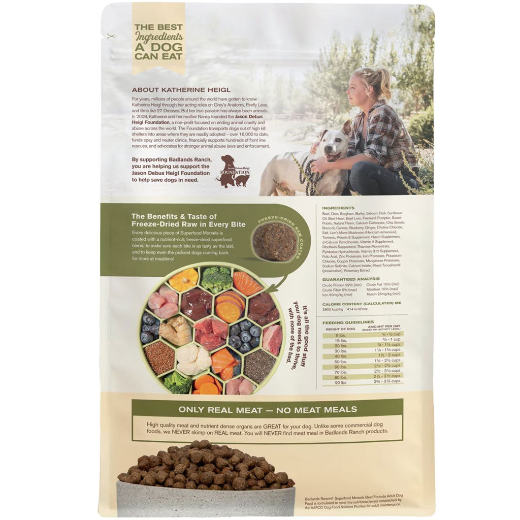 Badlands Ranch Superfood Complete Raw Coated Morsels Beef Dog Food delivers exceptional nutrition. Bite-sized and crunchy, the morsels are made with beef coated in a freeze-dried raw coating, ensuring maximum flavor and nutrition. Superfoods such as blueberries, turmeric, salmon oil, and ginger nourish your dog's digestive health, joints, skin, and immune system in this grain-free, high-protein formulation. Suitable for all sizes, this food combines raw benefits with kibble convenience. Nature's best made easy, every morsel.