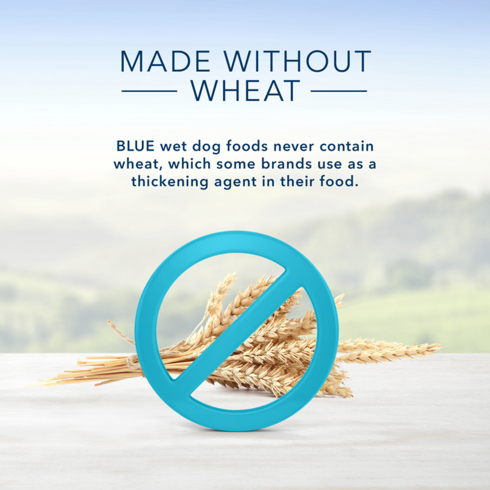 - WHOLESOME INGREDIENTS: BLUE wet dog food contains NO chicken (or poultry) by-product meals, NO corn, wheat (a common thickening agent used by other brands) or soy, and NO artificial flavors or preservatives