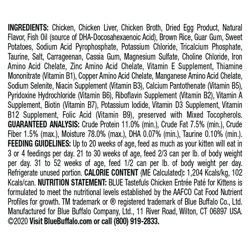BLUE Tastefuls silky-smooth paté for kittens starts with real chicken as the first ingredient, plus wholesome brown rice and sweet potatoes. Made from the finest natural ingredients enhanced with vitamins, minerals and other nutrients, it?s formulated with DHA to support your kitten?s cognitive development. Our canned food has the great taste cats want with the healthy ingredients you prefer feeding. Let your kitten try this mouthwatering wet cat food to see why one taste is all it takes!