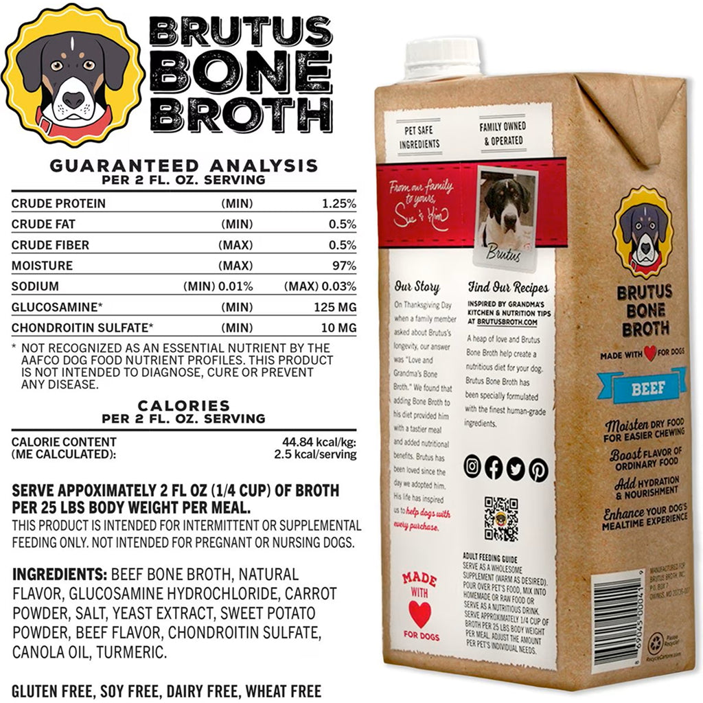 Brutus Bone Broth Beef is an all-natural, human-grade broth designed to support dogs’ health and hydration. Enriched with glucosamine, chondroitin, and turmeric, it promotes joint care, digestion, and immunity. With a low-sodium, low-phosphorus profile, this broth is ideal as a meal topper, treat, or hydration aid, appealing to picky eaters and suitable for most dogs.
