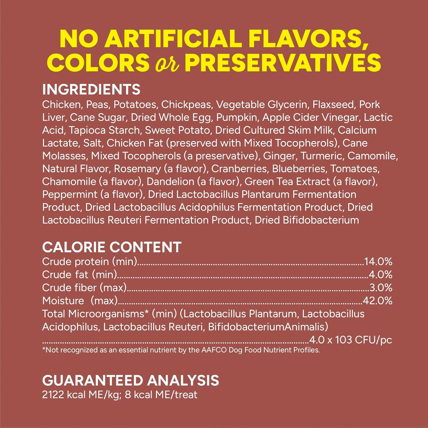 Chicken, Peas, Potatoes, Chickpeas, Vegetable Glycerin, Flaxseed, Pork Liver, Cane Sugar, Dried Whole Egg, Pumpkin, Apple Cider Vinegar, Lactic Acid, Tapioca Starch, Sweet Potato, Dried Cultured Skim Milk, Calcium Lactate, Salt, Chicken Fat (preserved with Mixed Tocopherols), Cane Molasses, Mixed Tocopherols (a preservative), Ginger, Turmeric, Camomile, Natural Flavor, Rosemary (a flavor), Dandelion (a flavor), Green Tea Extract (a flavor), Peppermint (a flavor), Dried Lactobacillus Plantrarum Fermentaion Product, Dried Lactobacillus Acidophilus Fermentation Product, Dried Lactobacillus Reuteri Fermentation Product, Dried Bifidobacterium.