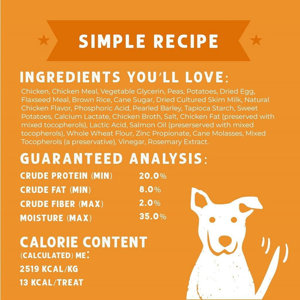 Chicken, Chicken Meal, Vegetable Glycerin, Peas, Potatoes, Dried Egg, Flaxseed Meal, Brown Rice, Cane Sugar, Dried Cultured Skim Milk, Natural Chicken Flavor, Phosphoric Acid, Pearled Barley, Tapioca Starch, Sweet Potatoes, Calcium Lactate, Chicken Broth, Salt, Chicken Fat (preserved with mixed tocopherols), Lactic Acid, Salmon Oil (preserserved with mixed tocopherols), Whole Wheat Flour, Zinc Propionate, Cane Molasses, Mixed Tocopherols (a preservative), Vinegar, Rosemary Extract.