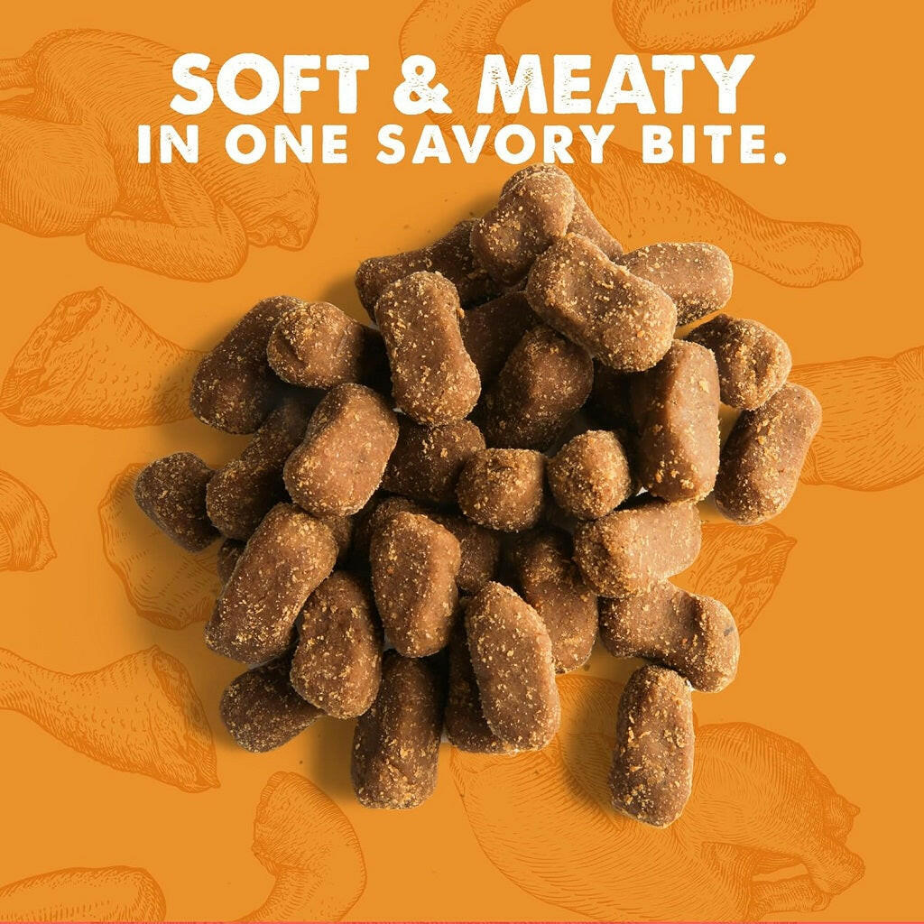 - Crave-able soft and chewy textured chicken treats with jerky bits.