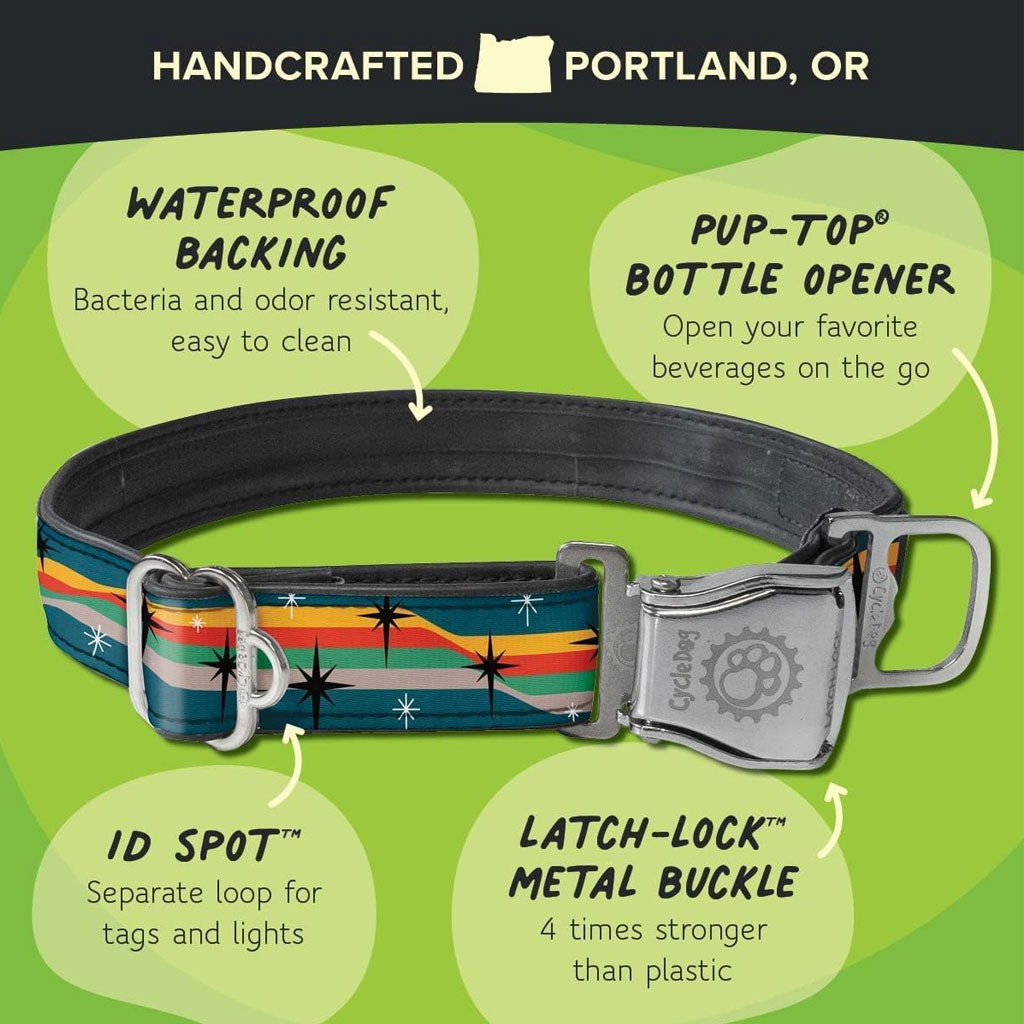 The Cycle Dog Regular Width Collar – Metal Buckle, Orange Max Reflective is a rugged, eco-friendly collar designed for style, safety, and all-season adventure. Made with post-consumer recycled waterproof backing, this collar is stink-proof, quick-drying, and built to last. The MAX Reflective layer ensures superior visibility during early morning or nighttime walks, while the metal latch-lock buckle provides unmatched strength and security. Its vibrant safety orange color enhances visibility, and the integrated Pup Top bottle opener and ID attachment make it a practical favorite among active dog parents.