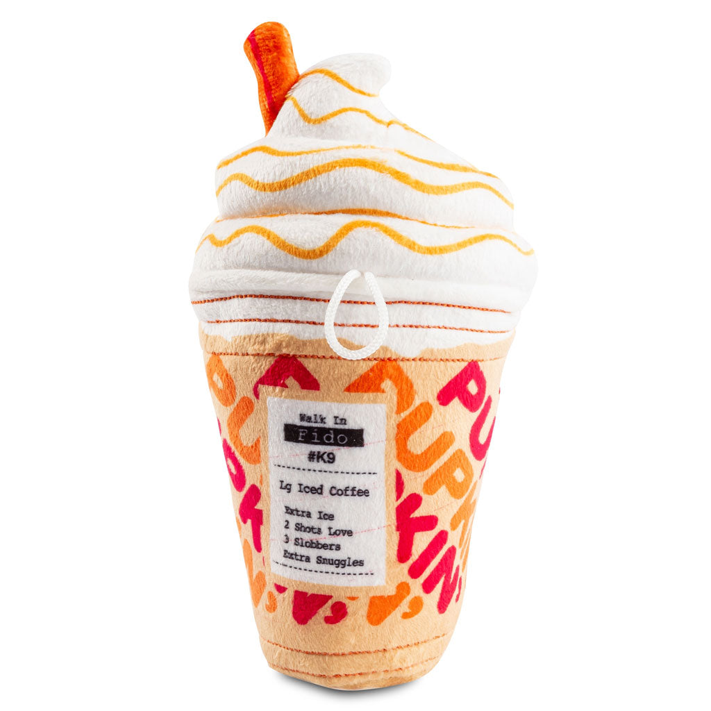 It’s a Halloween-themed plush dog toy designed to look like an iced pumpkin spice coffee from the fictional “Pupkin' Donuts” — a playful parody from the Haute Diggity Dog collection.