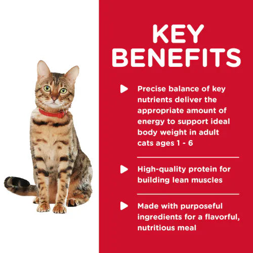 - Precise balance of key nutrients deliver the appropriate amount of energy to support ideal body weight in adult cats ages 1 - 6