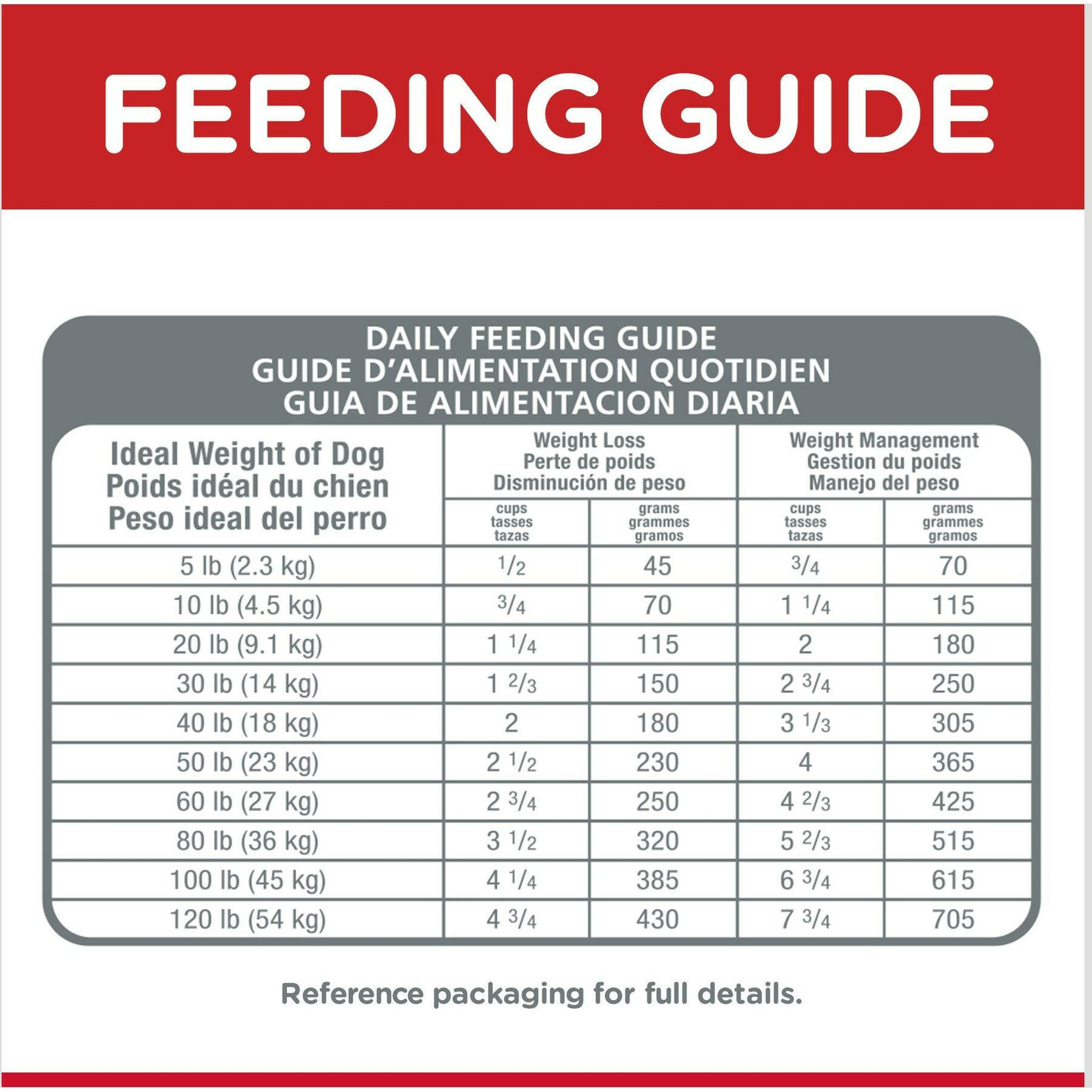 | Ideal Weight of Dog — lbs (kgs) | Amount per Day - cups (grams) - Weight loss | Amount per Day - cups (grams) - Adult maintenance |