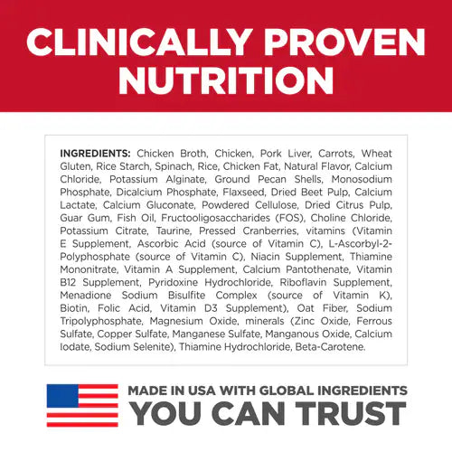 Chicken Broth, Chicken, Pork Liver, Carrots, Wheat Gluten, Rice Starch, Spinach, Rice, Chicken Fat, Natural Flavor, Calcium Chloride, Potassium Alginate, Ground Pecan Shells, Monosodium Phosphate, Dicalcium Phosphate, Flaxseed, Dried Beet Pulp, Calcium Lactate, Calcium Gluconate, Powdered Cellulose, Dried Citrus Pulp, Guar Gum, Fish Oil, Fructooligosaccharides (FOS), Choline Chloride, Potassium Citrate, Taurine, Pressed Cranberries, vitamins (Vitamin E Supplement, Ascorbic Acid (source of Vitamin C), L-Ascorbyl-2-Polyphosphate (source of Vitamin C), Niacin Supplement, Thiamine Mononitrate, Vitamin A Supplement, Calcium Pantothenate, Vitamin B12 Supplement, Pyridoxine Hydrochloride, Riboflavin Supplement, Menadione Sodium Bisulfite Complex (source of Vitamin K), Biotin, Folic Acid, Vitamin D3 Supplement), Oat Fiber, Sodium Tripolyphosphate, Magnesium Oxide, minerals (Zinc Oxide, Ferrous Sulfate, Copper Sulfate, Manganese Sulfate, Manganous Oxide, Calcium Iodate, Sodium Selenite), Thiamine Hydrochloride, Beta-Carotene.