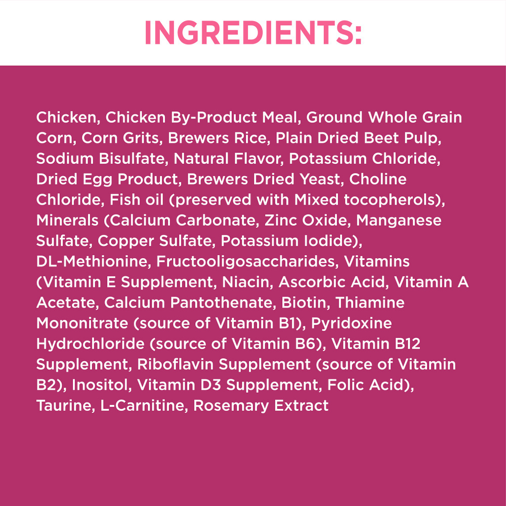 IAMS knows that each cat is different. That?s why our range of recipes has been specifically tailored to your cat?s needs and life stages. Keep your cats at their best with IAMS PROACTIVE HEALTH Adult Urinary Tract Health Dry Cat Food with Chicken. Perfect for outdoor or indoor cats, this formula helps reduce the pH in cat urine to promote urinary tract health. Chicken is the #1 ingredient in this protein-rich cat kibble formula. Plus, it includes vitamin E to maintain a healthy feline immune system, as well as essential nutrients, like calcium and potassium, for a healthy heart. The kibble has an optimal omega-6 and -3 fatty acid ratio for a soft, shiny coat, and the crunchy texture helps reduce plaque buildup. So, if you?re looking for a dry food for urinary tract health, get your paws on this? and keep your feline happy, healthy, and ready to pounce with IAMS.