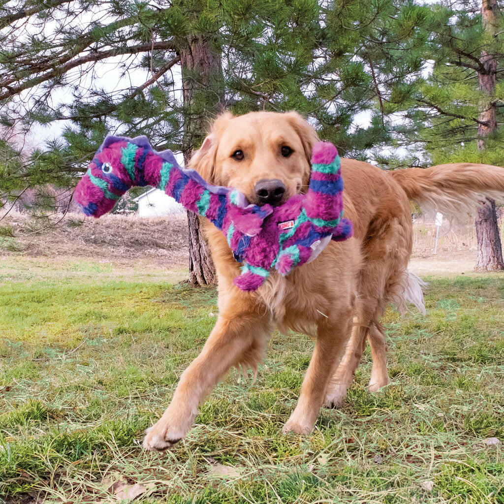 KONG Shakers Honkers Dragon’s magic lies in his internal neck tube that delights dogs’ natural instincts with an irresistible crunch that kicks up the fetching fun. His long, floppy body fuels shaking action and is great for tugging while the low tone squawk sparks interest and keeps dogs playing longer with a plush-covered pal great for cuddling in the liar after the action.