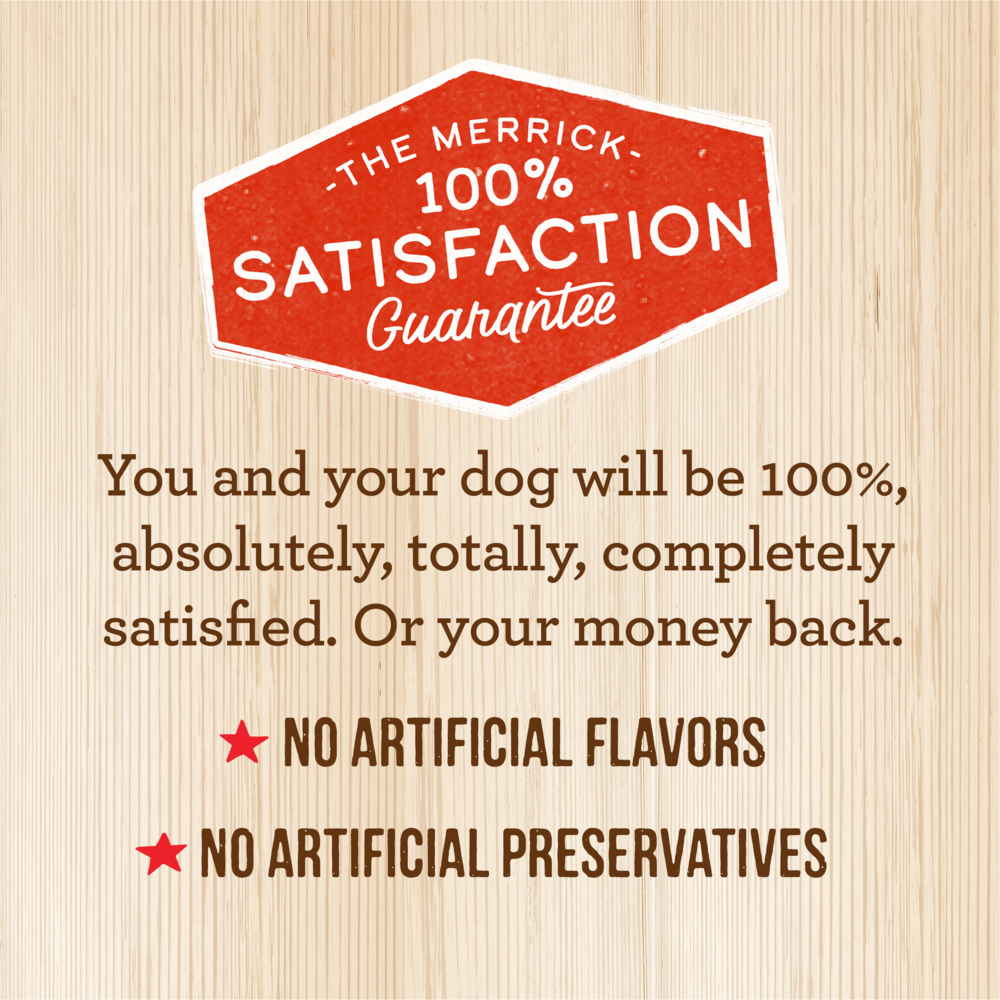 Merrick isn't your typical pet food company, and Merrick doesn't just make pet food. Merrick makes the best food ever for the best pet ever. Yours. The five star promise from Merrick is what's guaranteed to each and every dog and cat, along with their owners. Local growers, real whole foods, their own kitchen, balanced nutrition, and health you can see. Merrick creates real, wholesome recipes using USDA-inspected deboned meat and fresh produce for industry leading levels of protein, glucosamine and chondroitin. All of Merrick's foods are handcrafted in Hereford, Texas from USA farmers they know and trust. With no additives, sweeteners, colors or preservatives, real whole foods including high quality meats and fresh caught fish are the core of every Merrick dog and cat food. Merrick has been cooking their own foods in their own Texas kitchen for over 25 years. They stand behind their products with a 100% guarantee, promising that your dog or cat will be happier and healthier. You are what you eat, so why not feed your best friend the very best?