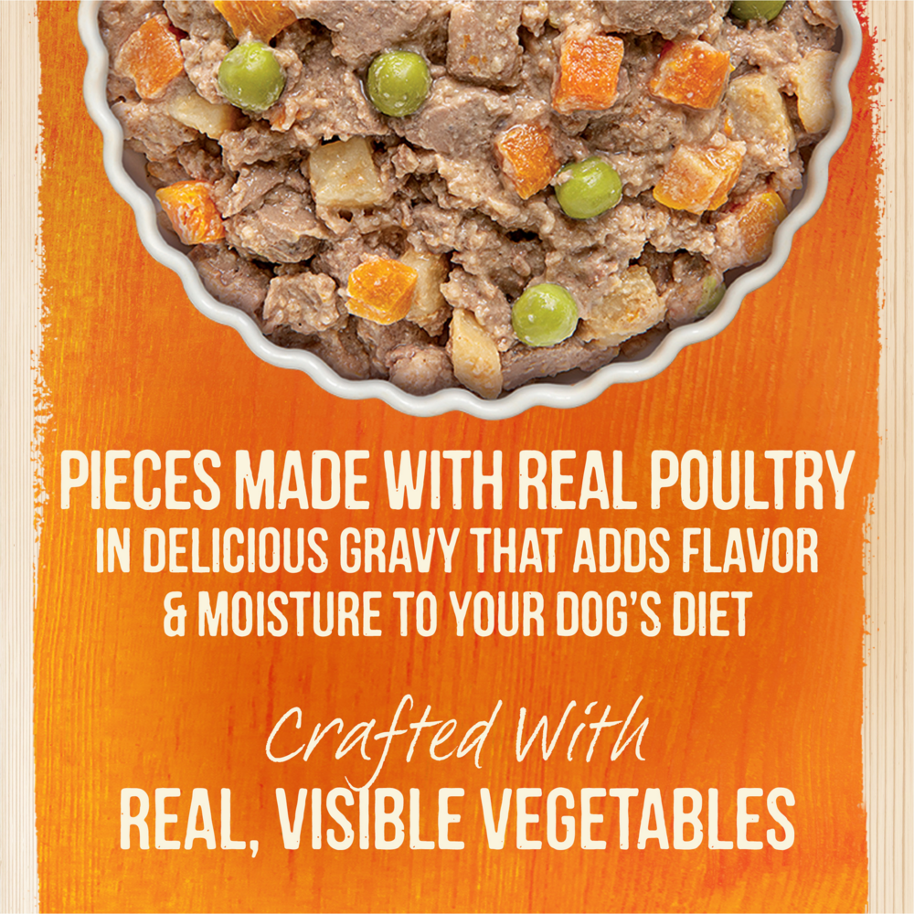 The first ingredient in Merrick Grain Free Wet Dog Food Grammy's Pot Pie is always real USDA-inspected deboned chicken. This real chicken dog food recipe also contains red jacket new potatoes, peas, carrots and red delicious apples to lend wholesome goodness and variety to your dog's menu. A savory dog food gravy made with chicken broth adds even more flavor and moisture to daily meals. To meet your dietary preferences, this grain free wet dog food with vegetables contains no artificial colors, flavors, preservatives or by-products. Use this Merrick moist dog food recipe as a topper for your dog's dry kibble, or serve it as a nutritious standalone meal. A convenient pull-tab can makes preparing your dog's meal quick and easy. Like all Merrick recipes, Grammy's Pot Pie was crafted in our Hereford, TX kitchen and cooked in the USA.Merrick Grain Free Wet Dog Food Grammy's Pot Pie- Real deboned chicken is the first ingredient- Grain free wet dog food also contains red jacket new potatoes, peas, carrots and red delicious apples- No artificial colors, flavors, preservatives or by-products- Dog food can features pull-tab for easy opening and fast serving