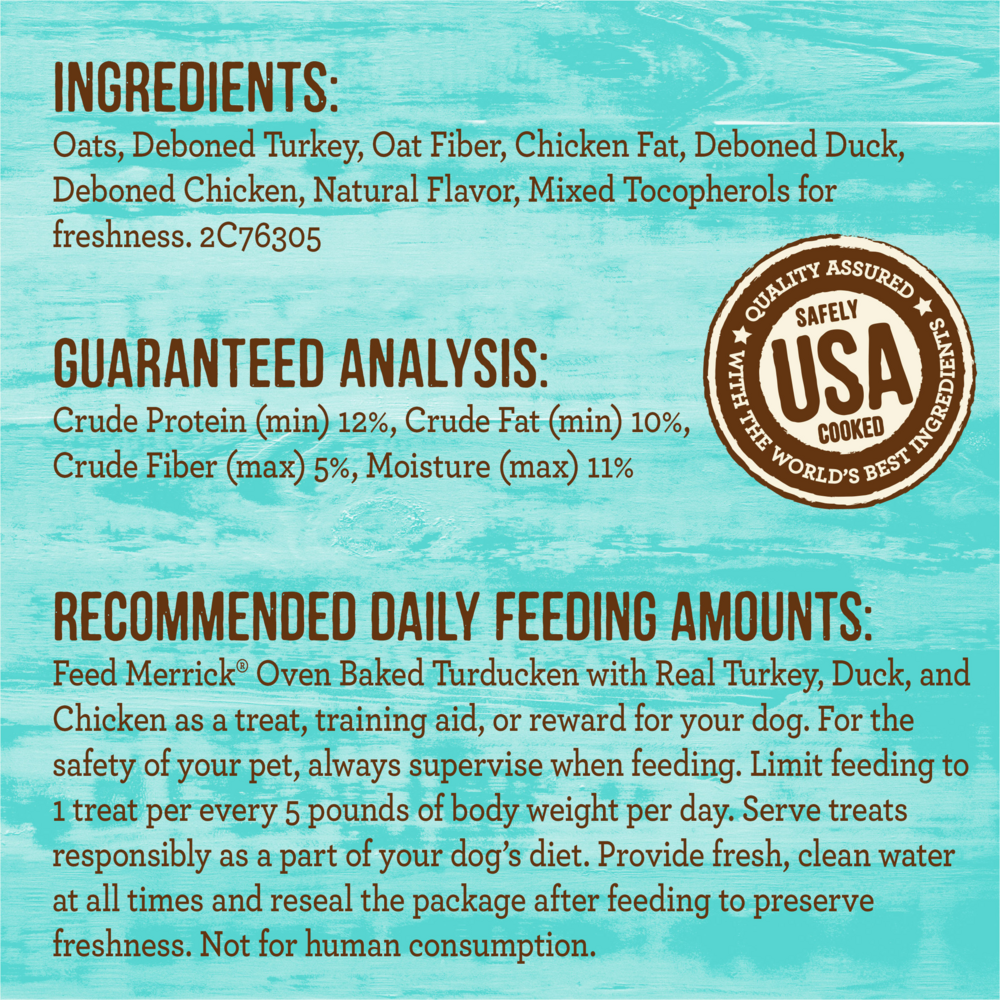 At Merrick, we make the best treats ever for your best dog ever. Our Oven Baked biscuits are inspired by home-made recipes using ingredients you could find in your own kitchen. With only 7, real, natural ingredients, you’ll feel good about treating your best friend to something delicious. Just as you would in your own home, these biscuits are hand-crafted and slowly baked for a tasty crunch. As with all of our products, these Oven Baked treats are made in the good old US of A and are free of corn, wheat, soy and artificial ingredients.Oven Baked and hand crafted in small batches for a great smell and taste- Real whole foods like deboned chicken, deboned beef, and real peanut butter- Only 7 ingredients (or less) in each recipe- Natural ingredients you could find in your own kitchen.- No corn, wheat, or soy and no artificial colors, flavors, preservatives or by-products