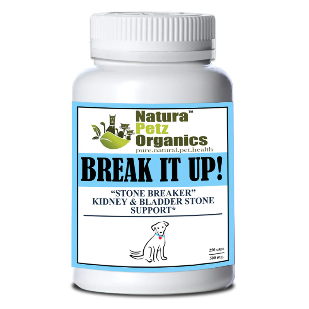 Break It Up! Stone Breaker is a holistic pet supplement formulated to help eliminate bladder, kidney, and gallbladder stones, crystals, and gravel in dogs and cats. This master herbal blend supports urinary health, reduces inflammation, prevents future stone formation, and promotes overall wellness. It is suitable for all life stages, using certified safe botanicals without artificial additives.