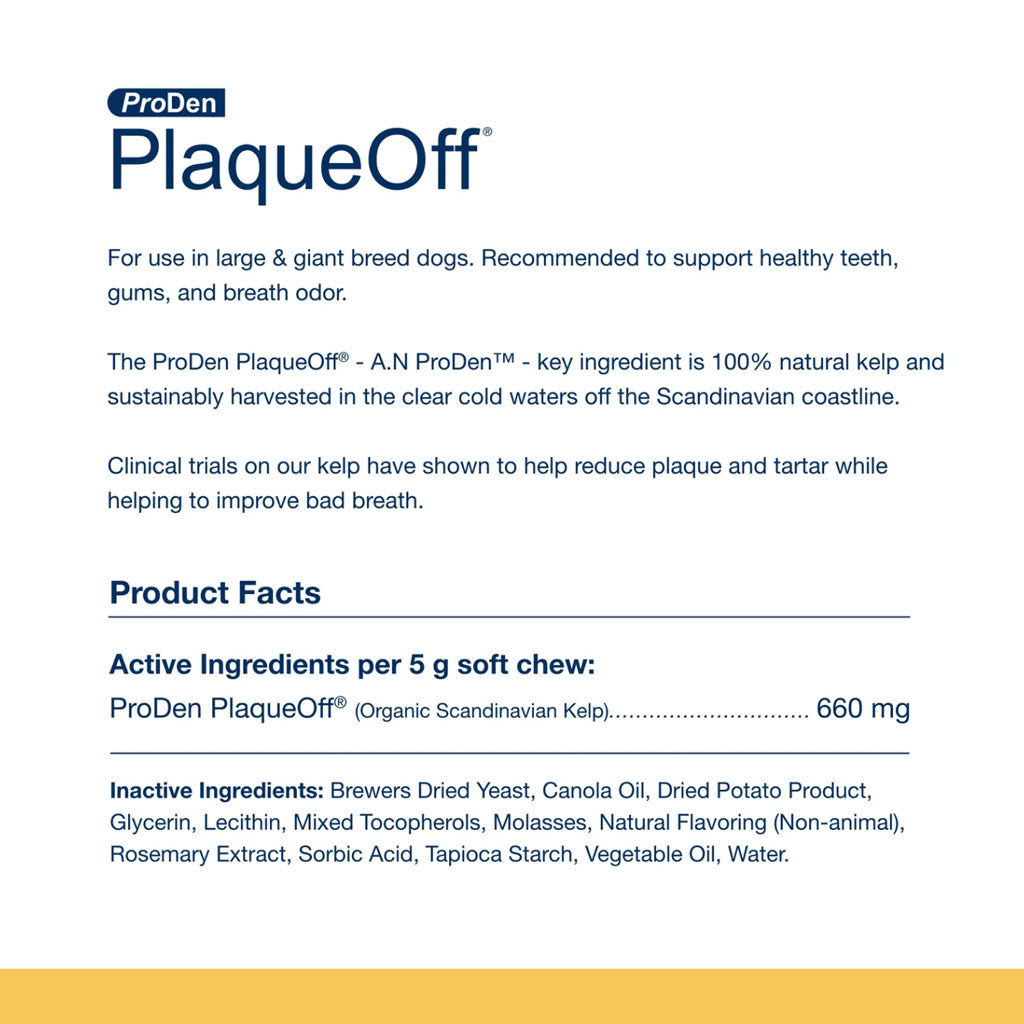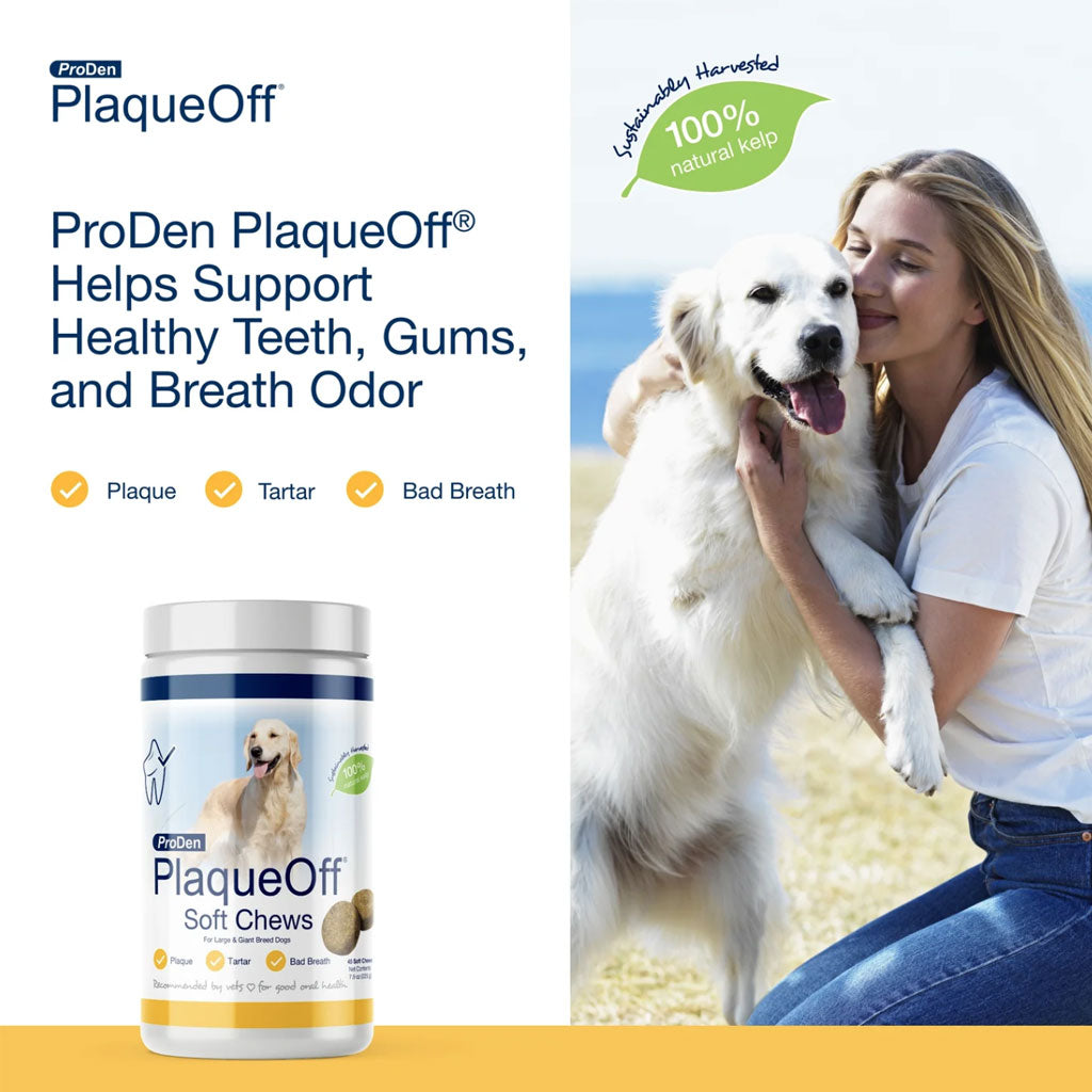 NaturVet ProDen PlaqueOff Soft Chews for Large & Giant Breed Dogs are an easy, effective way to keep your dog's teeth free of the plaque that leads to dental problems. Natural ingredients in the soft chews use a palatable flavor to prevent the growth of plaque and tartar while cleaning the teeth and leaving them smelling fresh. Safe for use in large and giant breeds, these work nicely in conjunction with regular oral care for your dog.