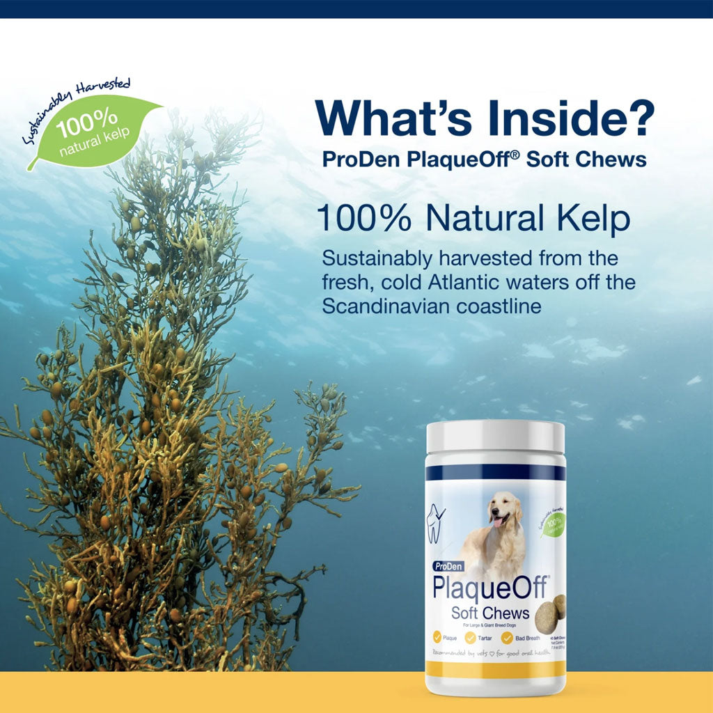 NaturVet ProDen PlaqueOff Soft Chews for Large & Giant Breed Dogs are a simple and effective way of caring for your dog's teeth. Formulated to reduce the formation of plaque and tartar, these soft chews help clean your dog's teeth and keep his breath fresh. These natural chews are prepared with clinically proven ProDen PlaqueOff and are easy on your dog's digestive system while being powerful enough for a hygienic oral cavity. Perfectly suited for large and giant breeds alike, these tasty chews make it simple to fit dental care into your dog's everyday life.