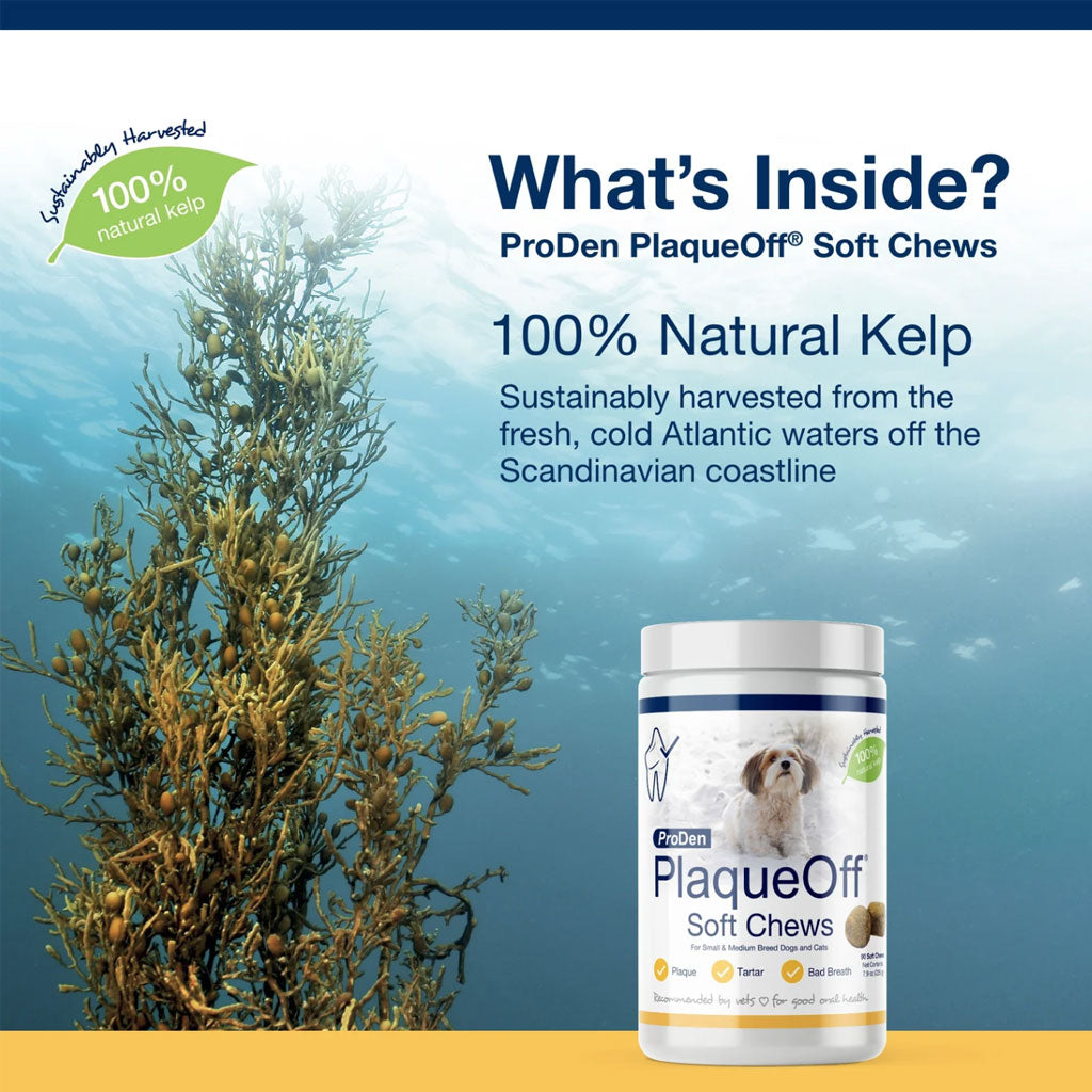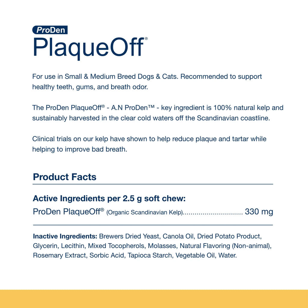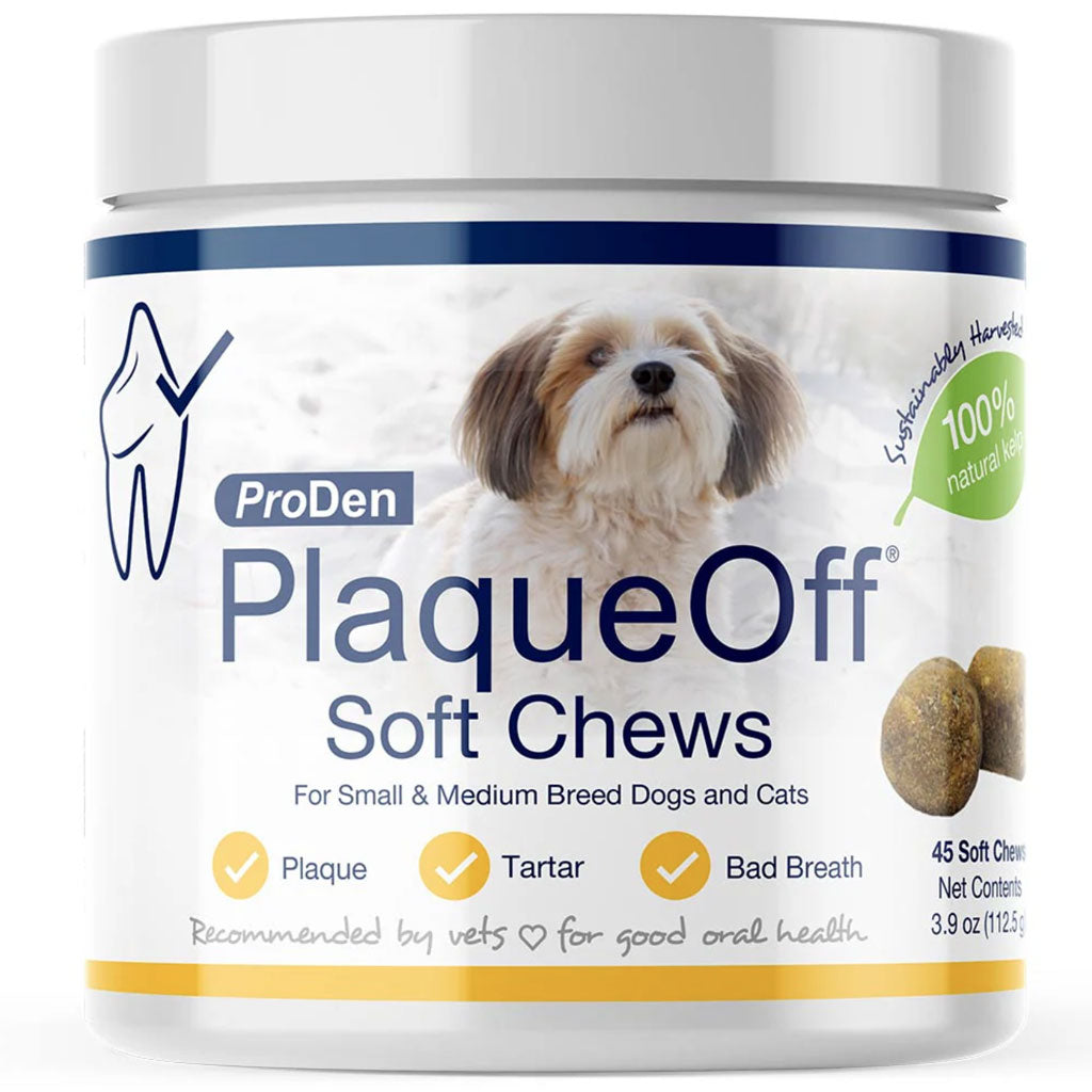 NaturVet ProDen PlaqueOff Soft Chews for Small & Medium Breed Dogs & Cats is a natural way to help take care of your pet's dental well-being. Fast-acting, soft chews combine with saliva to help reduce the formation of plaque and tartar while freshening breath. Convenient to add to your pet's oral care regimen, these chews can be used daily and are free from artificial ingredients.