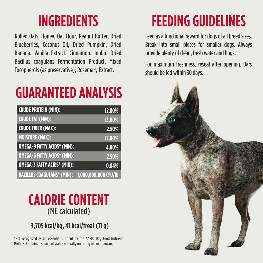Rolled Oats, Honey, Oat Flour, Peanut Butter, Dried Blueberries, Coconut Oil, Dried Pumpkin, Dried Banana, Vanilla Extract, Cinnamon, Inulin, Dried Bacillus coagulans Fermentation Product, Mixed Tocopherols (as preservative), Rosemary Extract.
