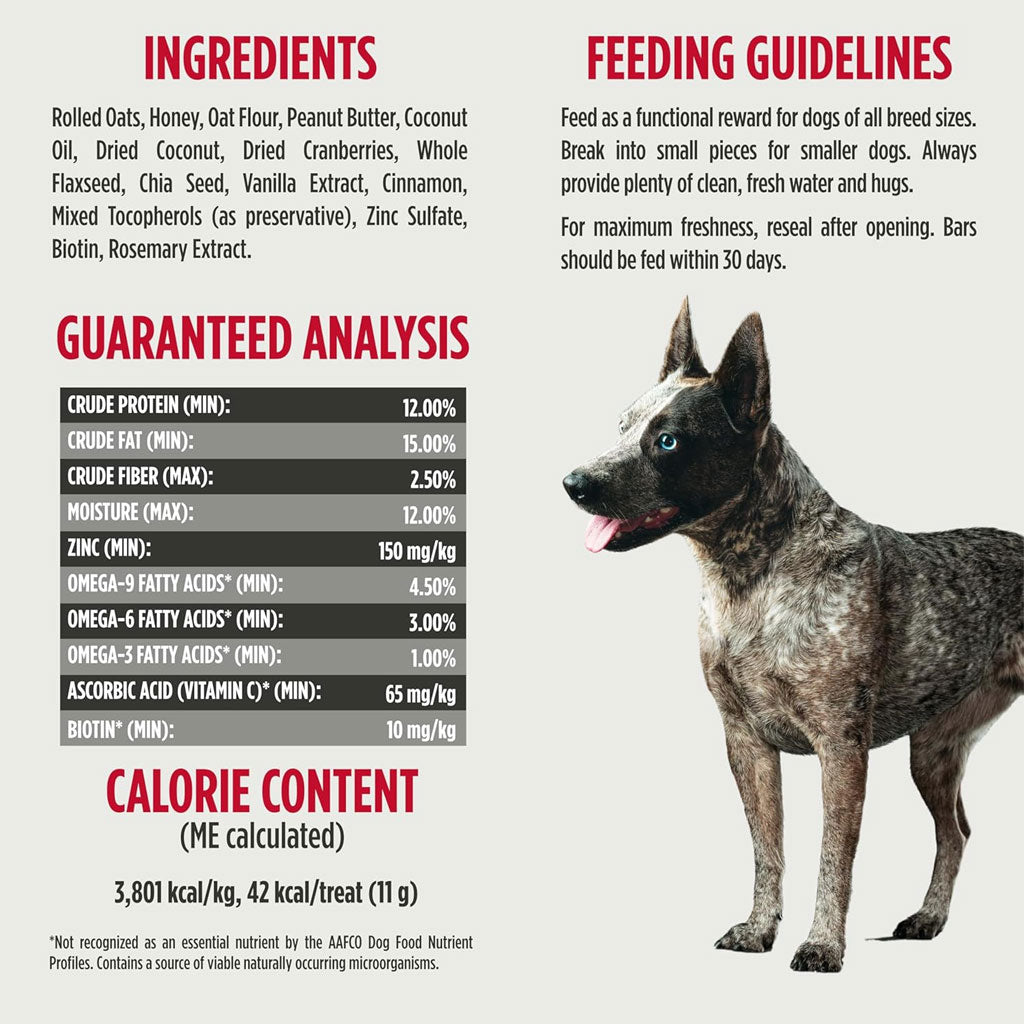 These are soft-baked granola bar-style dog treats formulated with functional ingredients like coconut, cranberries, and flaxseed to help support healthy skin and a shiny coat.