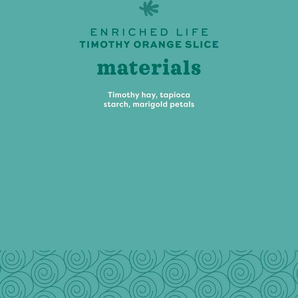 Keep your buck-toothed buddy living his best life with the Oxbow Enriched Life Timothy Orange Slice Small Animal Toy. This guinea pig and rabbit chew toy features a fun design that encourages mental and physical enrichment in your favorite pet pal. It is the perfect way to help strengthen the bond that you have with your furry friend while encouraging his natural instincts to chew and play. This small pet chew toy is crafted using high-fiber timothy hay and enticing marigold petals that are 100% pet-safe for the health and happiness of your cuddly companion.