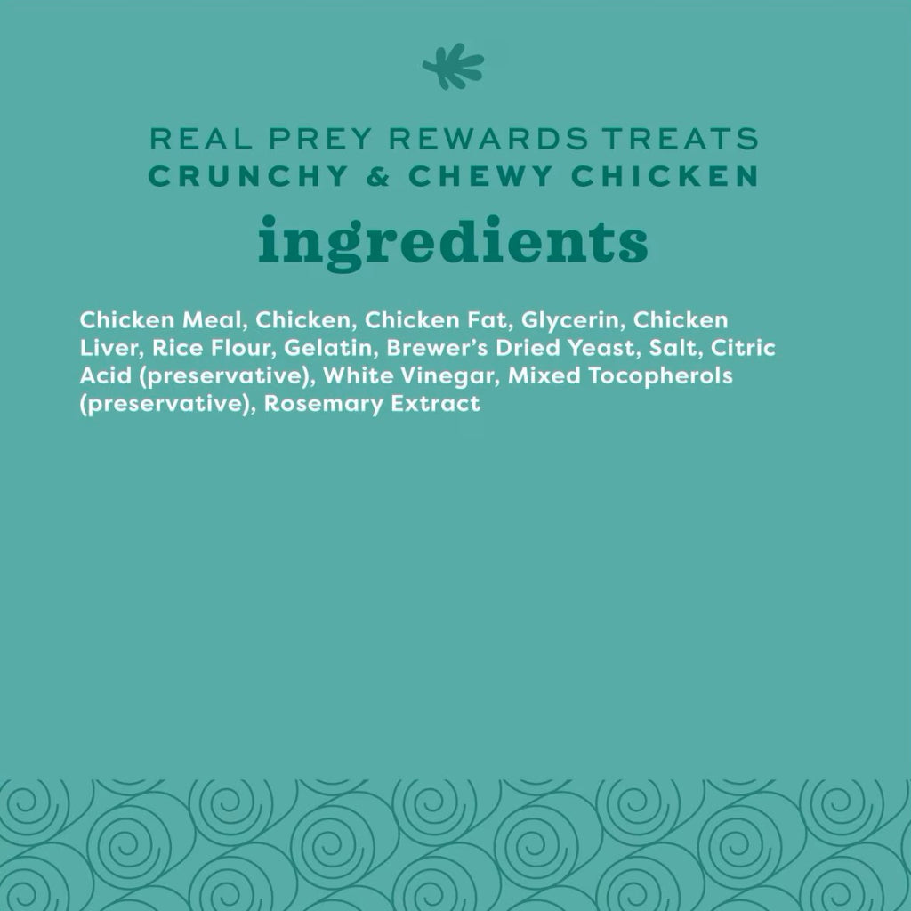 Chicken Meal, Chicken, Chicken Fat, Glycerin, Chicken Liver, Rice Flour, Gelatin, Brewer’s Dried Yeast, Salt, Citric Acid (preservative), White Vinegar, Mixed Tocopherols (preservative), Rosemary Extract.