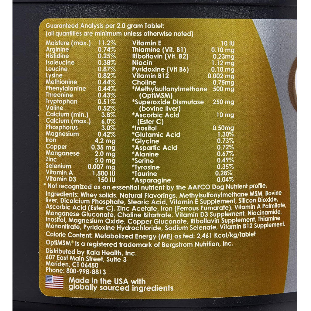 Whey Solids, Natural Flavorings, Methylsulfonylmethane MSM, Bovine Liver, Dicalcium Phosphate, Stearic Acid, Vitamin E Supplement, Silicon Dioxide, Ascorbic Acid (Ester C), Zinc Acetate, Iron (Ferrous Fumarate), Vitamin A Palmitate, Manganese Gluconate, Choline Bitartrate, Vitamin D3 Supplement, Niacinamide, Inositol, Magnesium Oxide, Copper Gluconate, Riboflavin Supplement, Thiamine Mononitrate, Pyridoxine Hydrochloride, Sodium Selenate, Vitamin B12 Supplement.