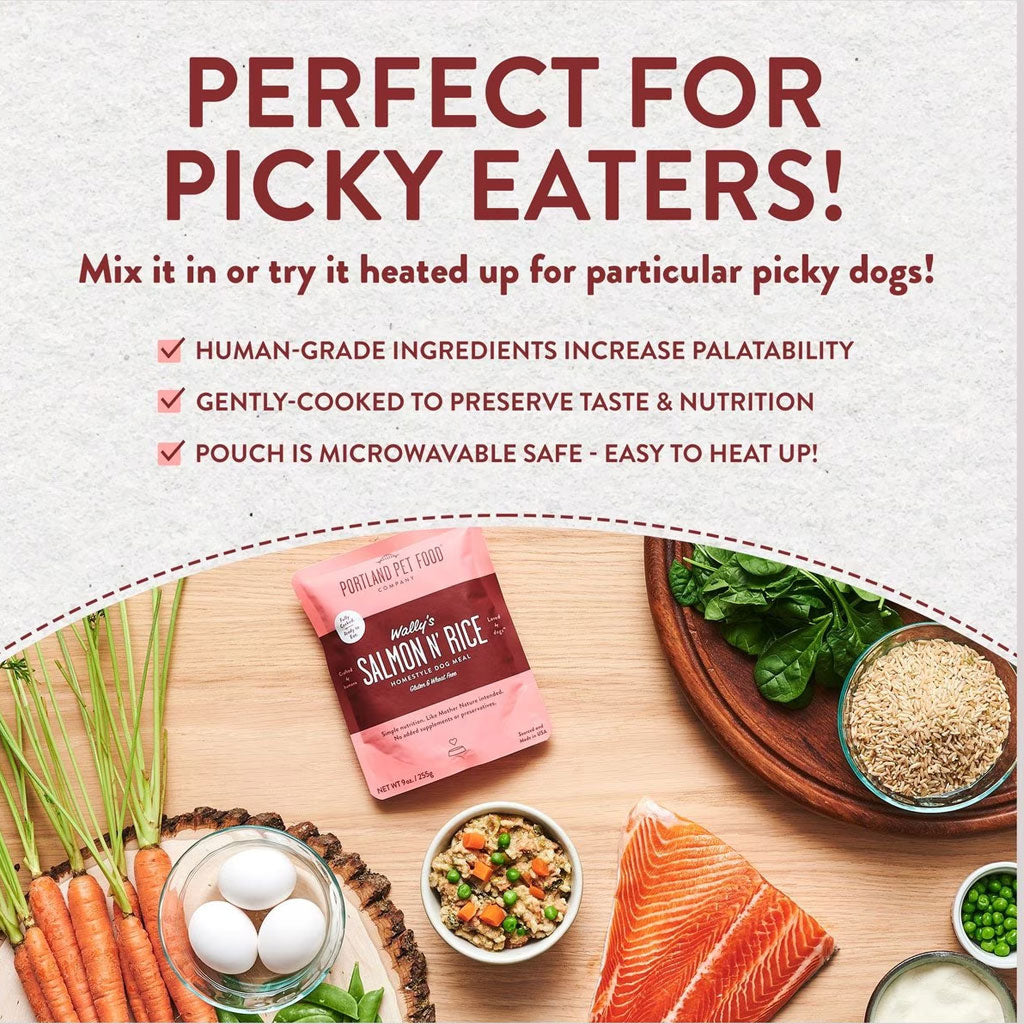 Wally's Salmon N' Rice Homestyle Wet Dog Food Topper by Portland Pet Food Company is a delectable and nutritious addition to your dog's meals. This homestyle topper is enriched with 100% natural ingredients sustainably caught salmon for rich protein and wholesome rice, thereby being a rich source of other nutrients. Great for finicky eaters or to enhance any meal, this topper can be mixed with dry kibble or served as a standalone meal. Made without artificial additives, fillers, and preservatives, Wally's Salmon N' Rice is formulated to give your dog an added bump in overall health and satisfaction flavor dogs will love, the nutrition they need.