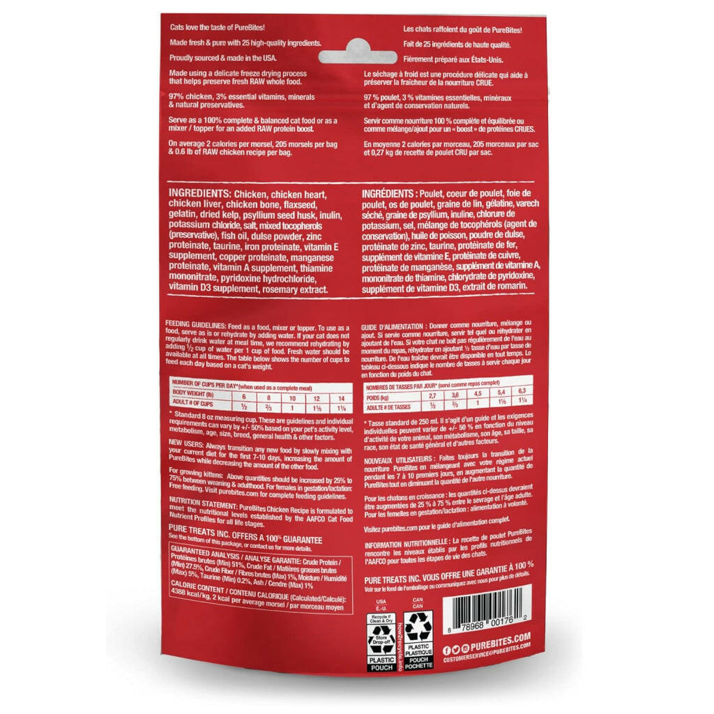 Rip open the bag and feed as a healthy, nutritious, and flavorful everyday complete and balanced RAW freeze-dried cat food, or as a mixer or topper for your cat. To use as a food, serve as is or rehydrate by adding water. If your cat does not regularly drink water at mealtime, we recommend rehydrating by adding a 1/2 cup of water per 1 cup of food. Fresh water should be available at all times. PureBites Chicken Recipe is formulated to meet the nutritional levels established by the AAFCO Cat Food Nutrient Profiles for all life stages. Refer to packaging for complete feeding guidelines including specific quantities to feed by weight, transitioning to PureBites from your current diet, and feeding guidelines for kittens.