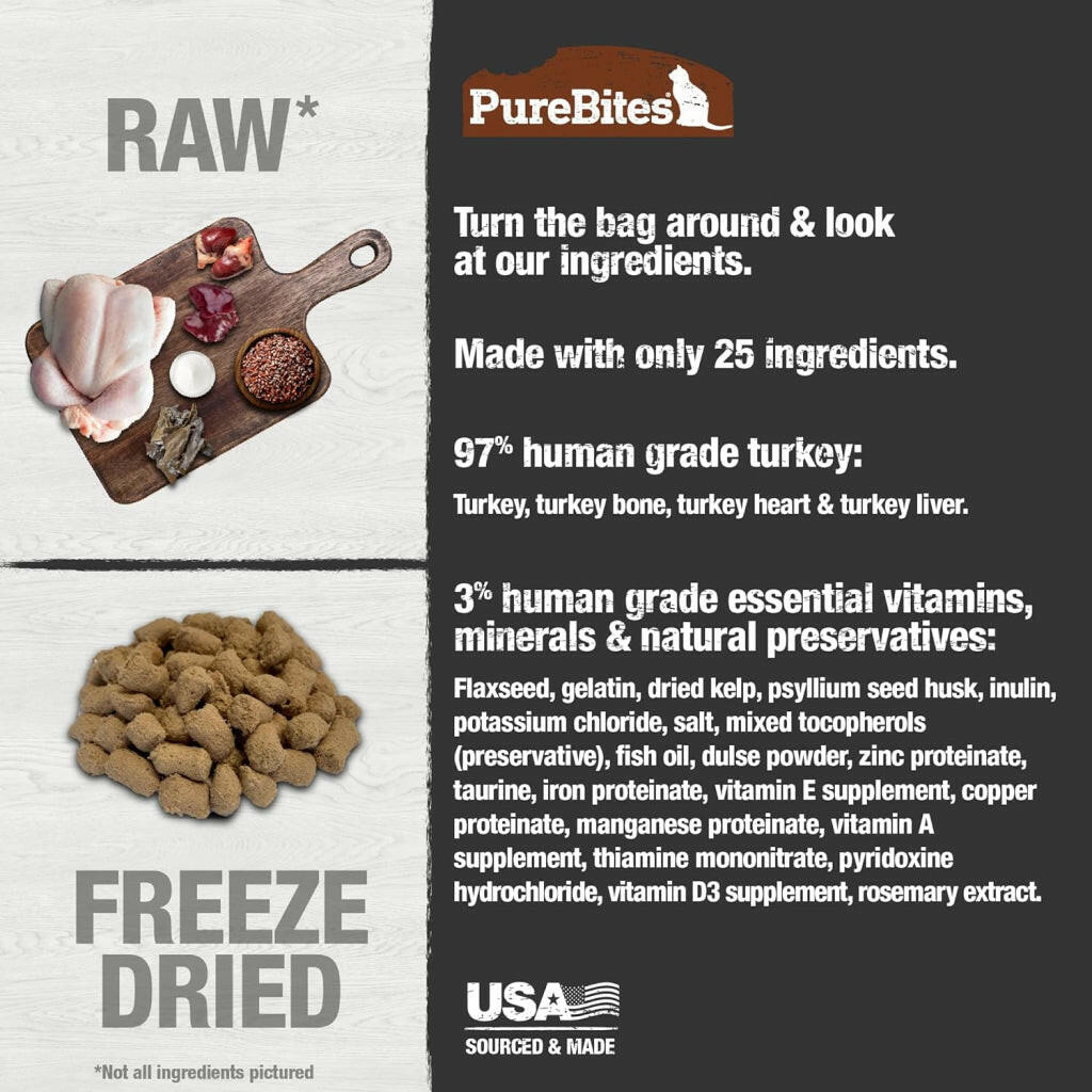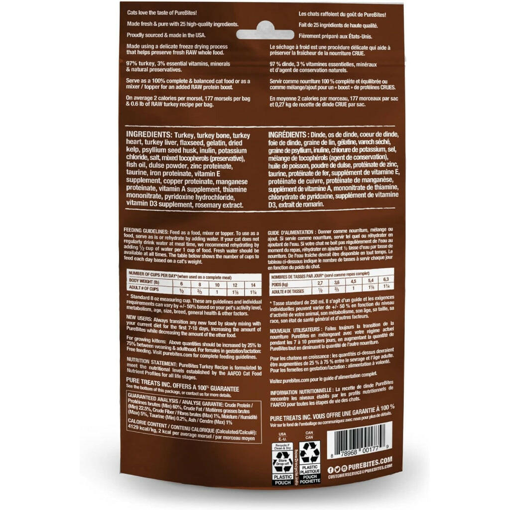 Rip open the bag and feed as a healthy, nutritious, and flavourful everyday complete and balanced RAW freeze dried cat food, or as a mixer or topper for your cat. To use as a food, serve as is or rehydrate by adding water. If your cat does not regularly drink water at mealtime, we recommend rehydrating by adding a 1/2 cup of water per 1 cup of food. Fresh water should be available at all times. PureBites Turkey Recipe is formulated to meet the nutritional levels established by the AAFCO Cat Food Nutrient Profiles for all life stages. Refer to packaging for complete feeding guidelines including specific quantities to feed by weight, transitioning to PureBites from your current diet, and feeding guidelines for kittens.