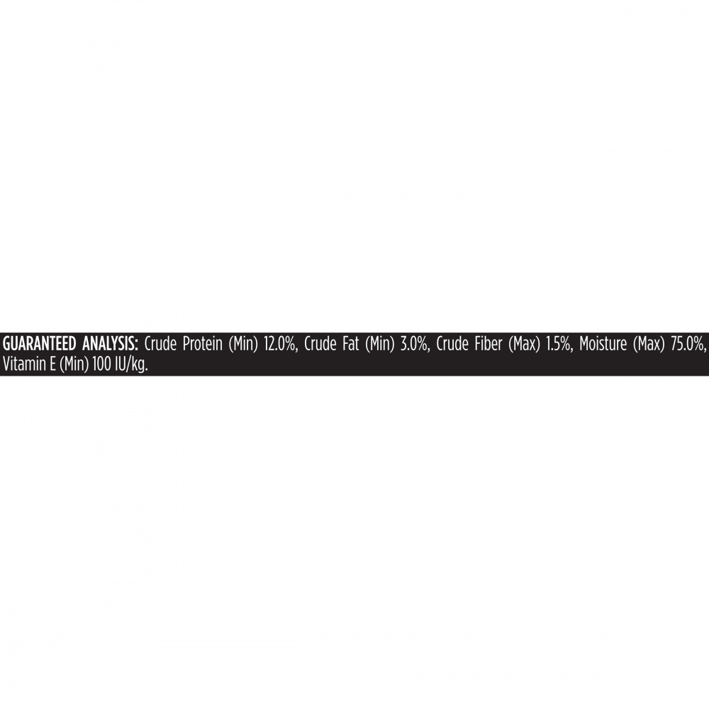 Water, beef, wheat gluten, liver, brown rice, meat by-products, corn starch-modified,vegetable oil (source of medium-chain triglycerides), tricalcium phosphate, artificial and natural flavors,soy flour, salt, MINERALS [potassium chloride, zinc sulfate, ferrous sulfate, copper sulfate, manganesesulfate, potassium iodide, sodium selenite], VITAMINS [Vitamin E supplement, niacin (Vitamin B-3),thiamine mononitrate (Vitamin B-1), calcium pantothenate (Vitamin B-5), pyridoxine hydrochloride(Vitamin B-6), Vitamin B-12 supplement, riboflavin supplement (Vitamin B-2), Vitamin A supplement, folicacid (Vitamin B-9), Vitamin D-3 supplement, biotin (Vitamin B-7)], choline chloride.Guaranteed Analysis