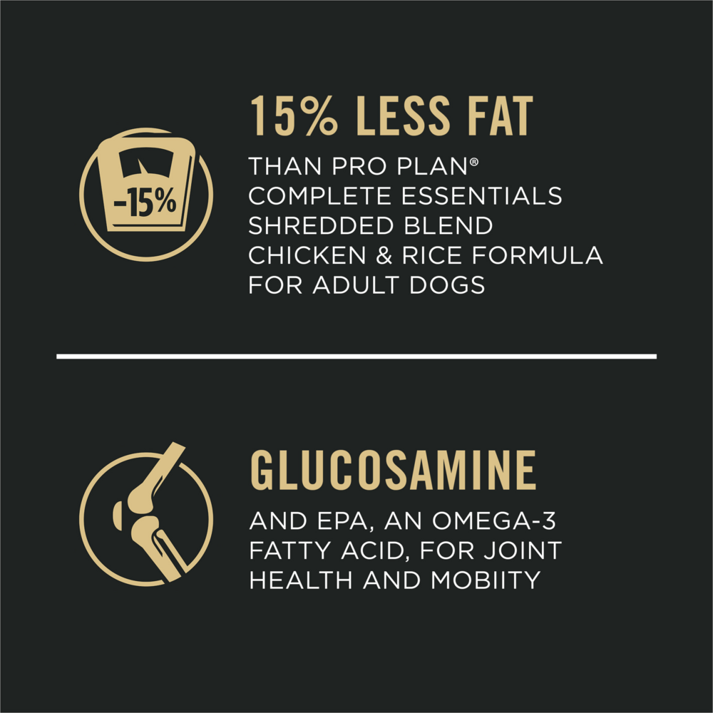 Help your large breed dog maintain a healthy weight when you serve him Purina Pro Plan Weight Management Large Breed Chicken and Rice Formula adult dry dog food. Each serving of this weight management dog food contains high-quality protein, including chicken as the first ingredient, and this features 27 percent protein and 9.5 percent fat to help him maintain an ideal weight and body condition. Natural prebiotic fiber for dogs, sourced from wheat bran, helps promote your canine companion's digestive health, while EPA, an omega-3 fatty acid, and glucosamine offer joint health and mobility. This adult dog food formula from Purina Pro Plan contains 15 percent less fat than Pro Plan Essentials Chicken and Rice Formula for Adult Dogs. This super-premium adult dog food is designed to provide 100 percent complete and balanced nutrition for overweight or less active dogs weighing over 50 pounds and to meet the unique needs of your large breed dog.