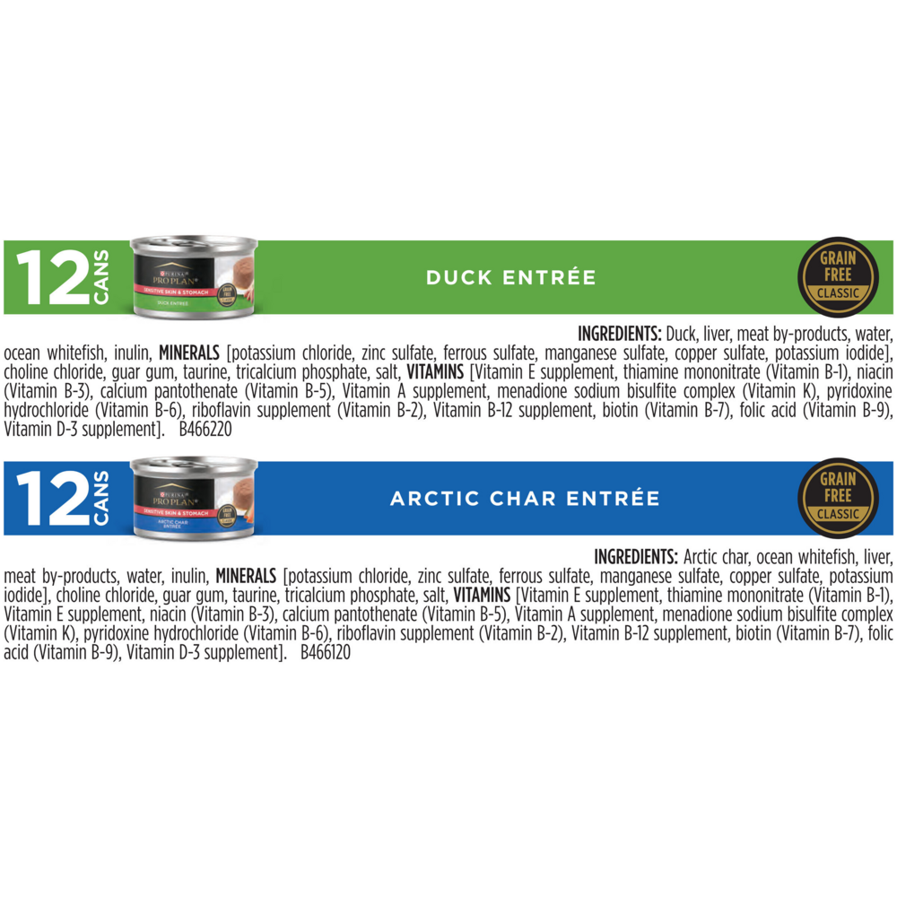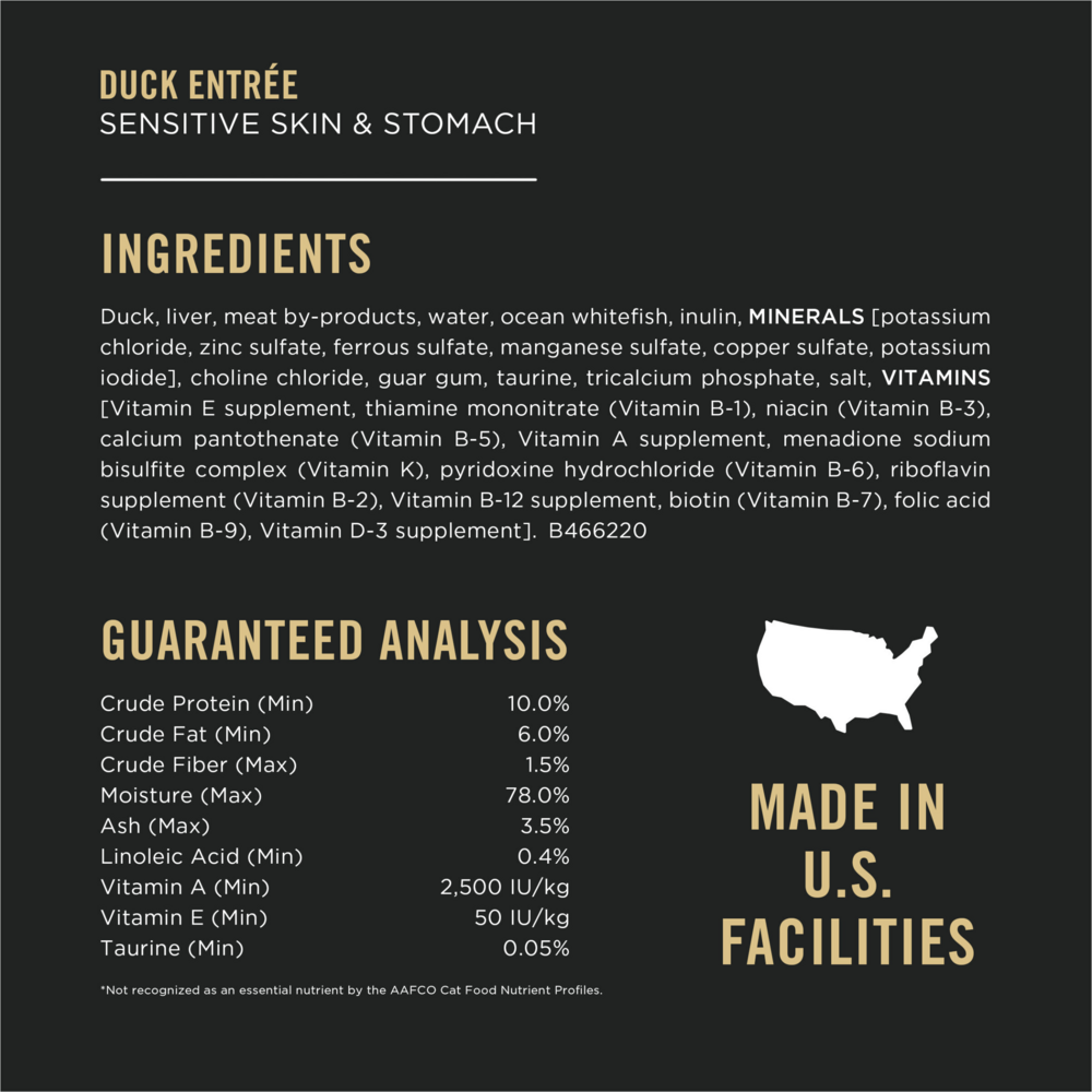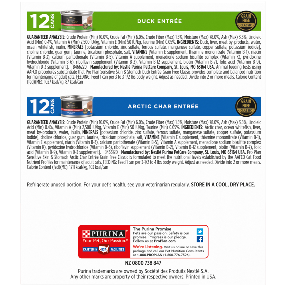 Help support your cat?s digestive health with the science-based nutrition in the Purina Pro Plan FOCUS Sensitive Skin & Stomach Poultry & Seafood Favorites adult wet cat food variety pack. We craft these grain-free recipes with high-quality protein sources, including real duck or arctic char, to help support her lean muscle mass. Linoleic acid, an omega-6 fatty acid, helps promote her healthy skin and coat. These highly digestible sensitive stomach wet cat food formulas also include taurine, an essential amino acid for cats, plus essential vitamins and minerals to help support her overall health. The soft pate texture of this high-protein cat food is easy for small mouths to nibble. When you stock your cupboard with this 24-count variety pack, your favorite feline always has a choice between a delicious seafood meal or a delectable poultry offering. Enjoy the confidence that comes from knowing you?re feeding your cherished companion a complete and balanced adult cat food that features real duck or fish as the #1 ingredient. We proudly craft this sensitive skin and stomach cat food in Purina-owned U.S. facilities.