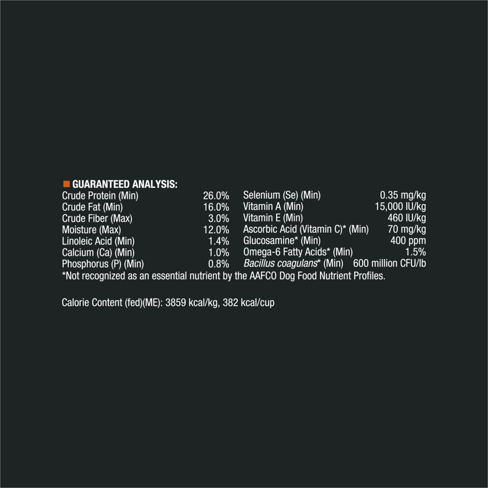 Beef, rice, whole grain wheat, corn gluten meal, poultry by-product meal (source ofglucosamine), soybean meal, whole grain corn, beef fat preserved with mixed-tocopherols, dried eggproduct, dried beet pulp, fish meal (source of glucosamine), natural flavor, glycerin, calcium carbonate,wheat bran, mono and dicalcium phosphate, soybean oil, salt, potassium chloride, VITAMINS [Vitamin Esupplement, niacin (Vitamin B-3), Vitamin A supplement, calcium pantothenate (Vitamin B-5), thiaminemononitrate (Vitamin B-1), Vitamin B-12 supplement, riboflavin supplement (Vitamin B-2), pyridoxinehydrochloride (Vitamin B-6), folic acid (Vitamin B-9), Vitamin D-3 supplement, menadione sodium bisulfitecomplex (Vitamin K), biotin (Vitamin B-7)], MINERALS [zinc proteinate, manganese proteinate, ferroussulfate, copper proteinate, calcium iodate, sodium selenite], choline chloride, L-ascorbyl-2-polyphosphate(Vitamin C), dried Bacillus coagulans fermentation product, garlic oil.Guaranteed Analysis