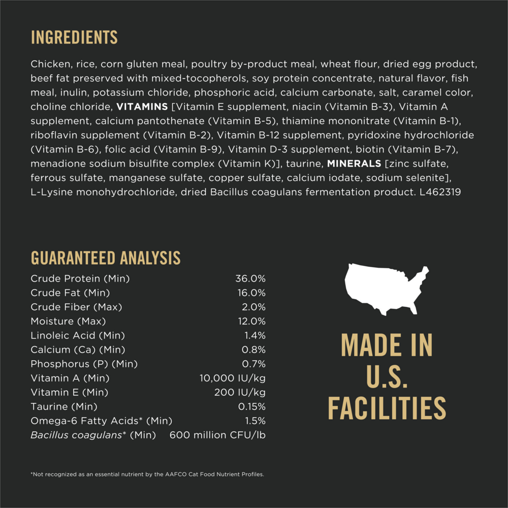 Chicken, Brewers Rice, Corn Gluten Meal, Poultry By-Product Meal, Dried Egg Product, Beef Fat Naturally Preserved With Mixed-Tocopherols, Wheat Flour, Soy Protein Isolate, Fish Meal, Natural Liver Flavor, Brewers Dried Yeast, Inulin, Potassium Chloride, Added Color, L-Lysine Monohydrochloride, Phosphoric Acid, Salt, Calcium Carbonate, Vitamins [Vitamin E Supplement, Niacin (Vitamin B-3), Vitamin A Supplement, Calcium Pantothenate (Vitamin B-5), Thiamine Mononitrate (Vitamin B-1), Riboflavin Supplement (Vitamin B-2), Vitamin B-12 Supplement, Pyridoxine Hydrochloride (Vitamin B-6), Folic Acid (Vitamin B-9), Vitamin D-3 Supplement, Biotin (Vitamin B-7), Menadione Sodium Bisulfite Complex (Vitamin K)], Taurine, Choline Chloride, Minerals [Zinc Sulfate, Ferrous Sulfate, Manganese Sulfate, Copper Sulfate, Calcium Iodate, Sodium Selenite], Dried Bacillus Coagulans Fermentation Product, L-Ascorbyl-2-Polyphosphate (Vitamin C).Guaranteed Analysis
