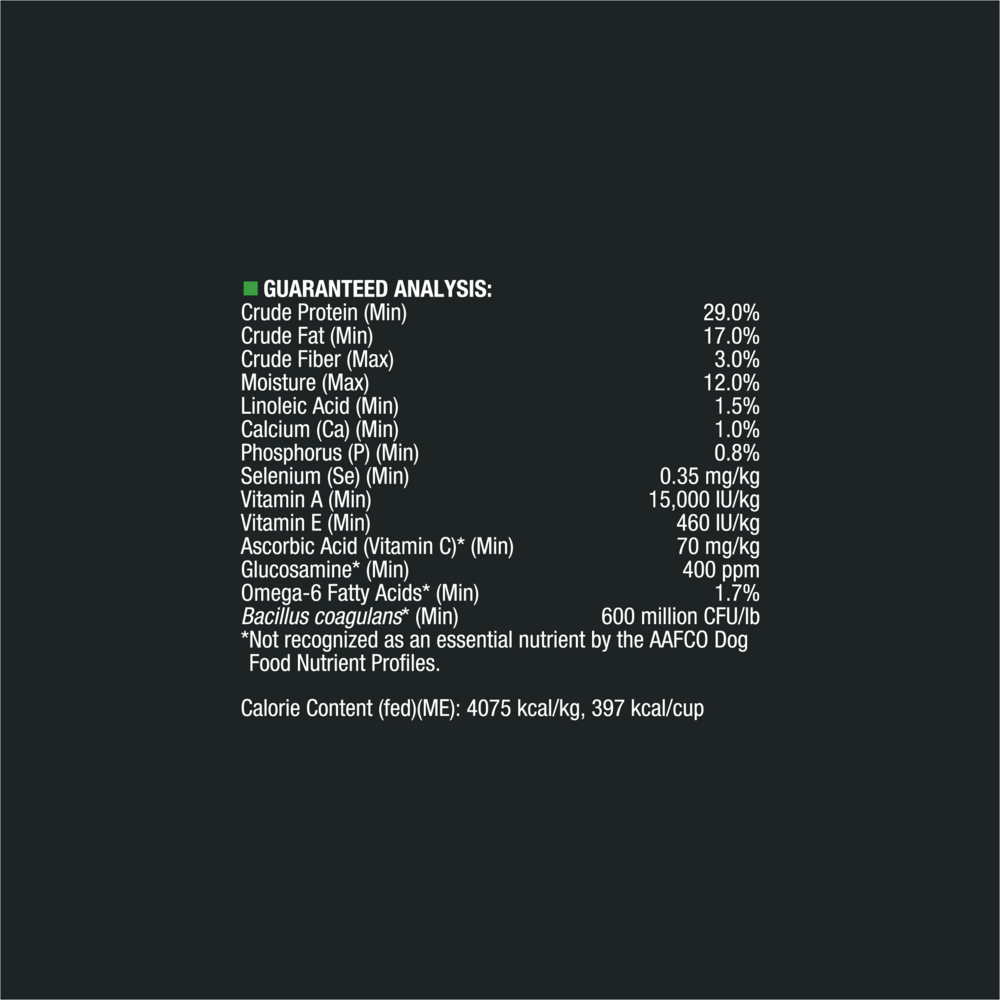 Chicken, rice, poultry by-product meal, beef fat preserved with mixed-tocopherols, corngluten meal, soybean meal, whole grain corn, whole grain wheat, corn germ meal, dried egg product,natural flavor, dried yeast, glycerin, calcium carbonate, wheat bran, fish meal, salt, mono and dicalciumphosphate, potassium chloride, MINERALS [zinc proteinate, manganese proteinate, ferrous sulfate,copper proteinate, calcium iodate, sodium selenite], VITAMINS [Vitamin E supplement, niacin (Vitamin B3), Vitamin A supplement, calcium pantothenate (Vitamin B-5), thiamine mononitrate (Vitamin B-1),Vitamin B-12 supplement, riboflavin supplement (Vitamin B-2), pyridoxine hydrochloride (Vitamin B-6),folic acid (Vitamin B-9), Vitamin D-3 supplement, menadione sodium bisulfite complex (Vitamin K), biotin(Vitamin B-7)], choline chloride, L-Lysine monohydrochloride, L-ascorbyl-2-polyphosphate (Vitamin C),dried Bacillus coagulans fermentation product, garlic oil.Guaranteed Analysis