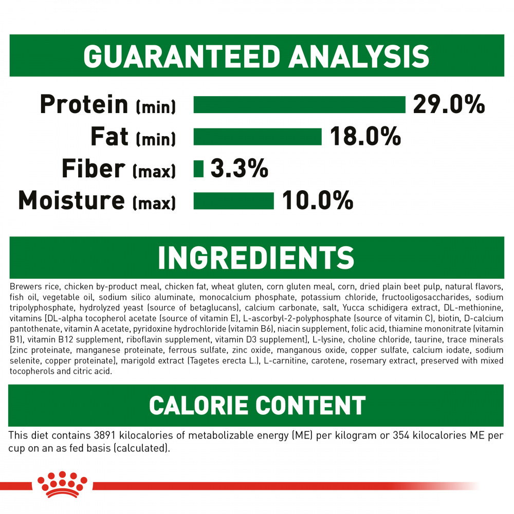 Brewers rice, chicken by-product meal, chicken fat, wheat gluten, corn gluten meal, corn, dried plain beet pulp, natural flavors, fish oil, vegetable oil, sodium silico aluminate, monocalcium phosphate, potassium chloride, fructooligosaccharides, sodium tripolyphosphate, hydrolyzed yeast (source of betaglucans), calcium carbonate, salt, Yucca schidigera extract, DL-methionine, vitamins [DL-alpha tocopherol acetate (source of vitamin E), L-ascorbyl-2-polyphosphate (source of vitamin C), biotin, D-calcium pantothenate, vitamin A acetate, pyridoxine hydrochloride (vitamin B6), niacin supplement, folic acid, thiamine mononitrate (vitamin B1), vitamin B12 supplement, riboflavin supplement, vitamin D3 supplement], L-lysine, choline chloride, taurine, trace minerals [zinc proteinate, manganese proteinate, ferrous sulfate, zinc oxide, manganous oxide, copper sulfate, calcium iodate, sodium selenite, copper proteinate], marigold extract (Tagetes erecta L.), L-carnitine, carotene, rosemary extract, preserved with mixed tocopherols and citric acid.Guaranteed Analysis