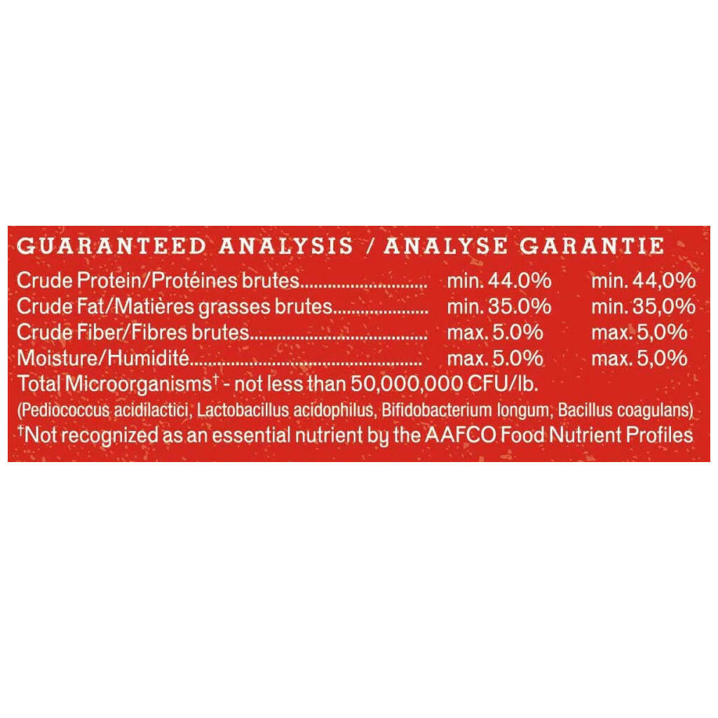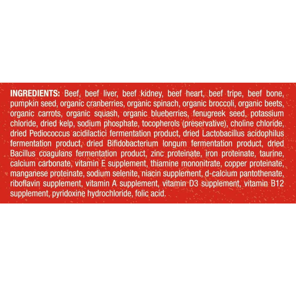 Beef, Beef Liver, Beef Heart, Beef Kidney, Beef Tripe, Ground Beef Bone, Organic Cranberries, Organic Spinach, Organic Broccoli, Organic Beets And Organic Beet Fiber, Organic Carrots, Organic Squash, Organic Apples, Organic Blueberries, Calcium Carbonate, Potassium Chloride, Direct-Fed Microorganisms (Pediococcus Acidilaticici, Lactobacillus Acidophilus, Bifidobacterium Longum, Entercoccus Faecium), Magnesium Oxide, Vitamin E Supplement, Vitamin D3 Supplement, Biotin, Potassium Iodide.