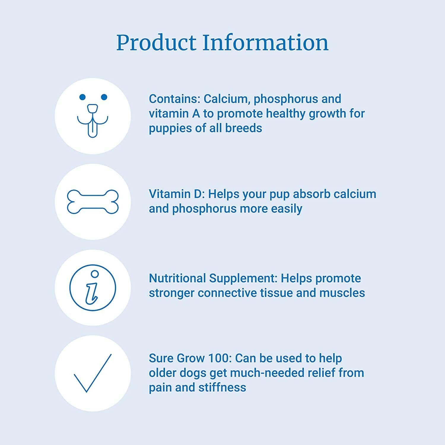 Whether you have a large breed puppy prone to orthopedic issues or a small breed dog needing proper skeletal support, Sure Grow 100 ensures optimal mineral absorption and bone mineralization, reducing the risk of rickets, limb deformities, and other developmental concerns.