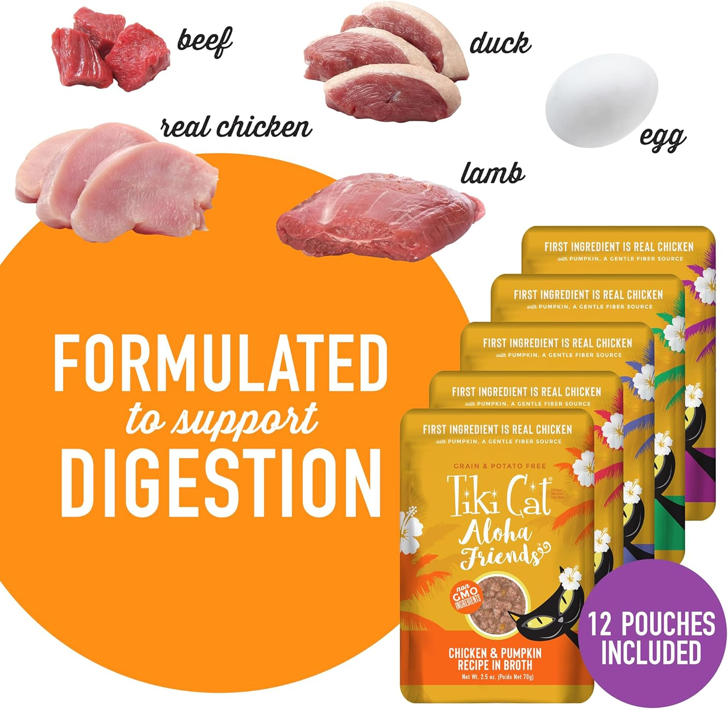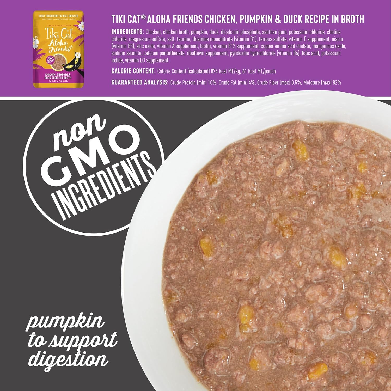 Serve your dude something different every day with the Tiki Cat Aloha Friends Chicken Variety Pack. These grain-free, wet cat foods feature chicken, beef, lamb, pork and duck for your amigo’s enjoyment. The thoughtful, high-protein recipes are low in carbohydrates and contain pumpkin as a gentle fiber source to encourage digestibility. These adult cat foods are served in a delicious chicken broth with a high moisture content for extra hydration. They do not contain any carrageenan for the benefit of your furry buddy.