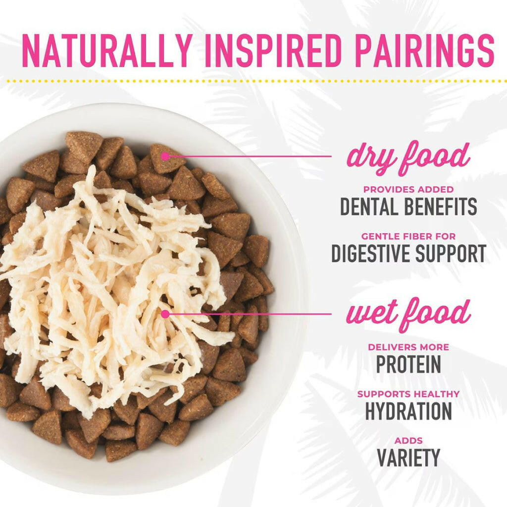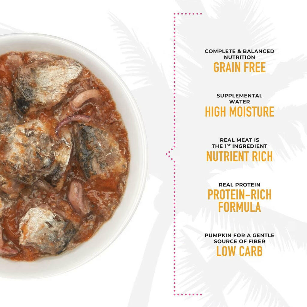 Tiki Cat Makaha Grill Mackerel & Sardine in Calamari Consomme cat food is highly palatable, with wild-caught mackerel and sardine slices as the top ingredients, slow-cooked in calamari consommé made with whole pieces of calamari. Since it’s made with actual stock, it provides plenty of moisture to keep your pal hydrated and support digestive and urinary health. And it’s packed with essential vitamins, omegas, minerals and taurine so it’s a complete and balanced diet for cats of all ages, with zero grains, gluten, carbohydrates, starches or flours.