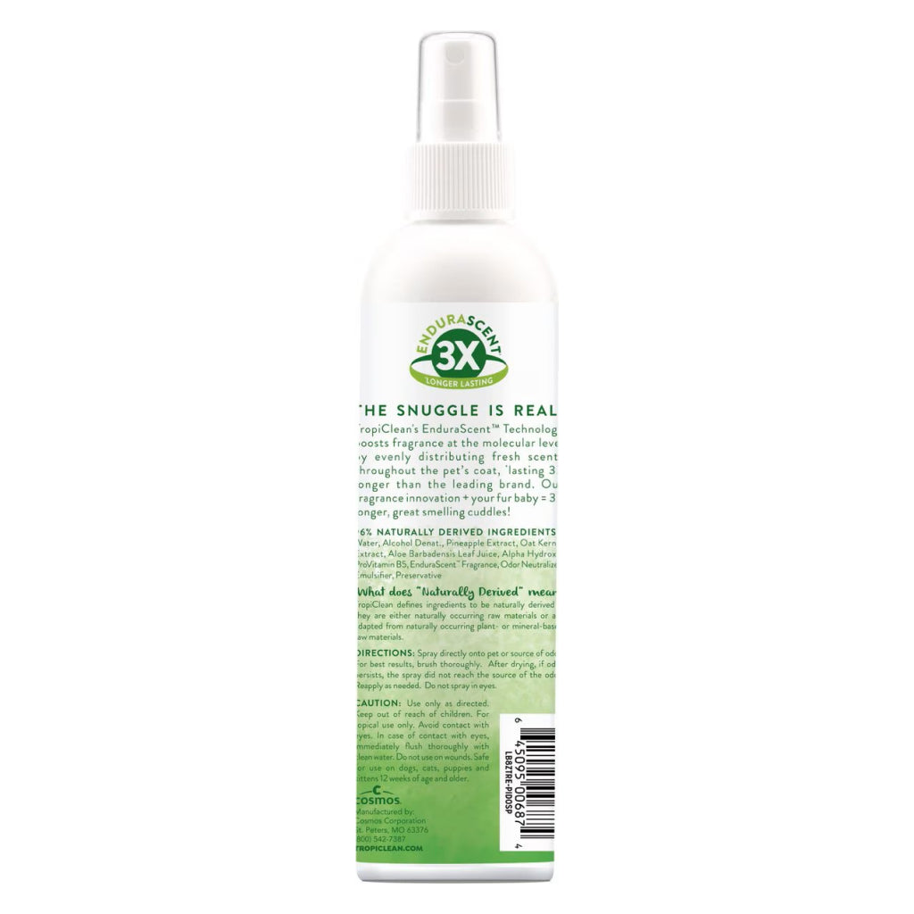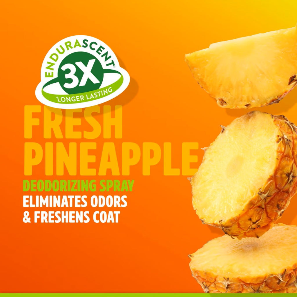 TropiClean EnduraScent Pineapple Scented Deodorizing Spray offers a refreshing, long-lasting pineapple fragrance. Its EnduraScent technology helps neutralize foul odors at the source. This safe, cruelty-free spray is perfect for keeping your pet’s coat fresh and clean, without harsh chemicals.
