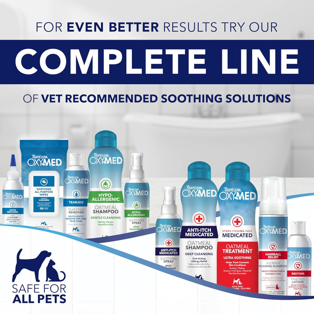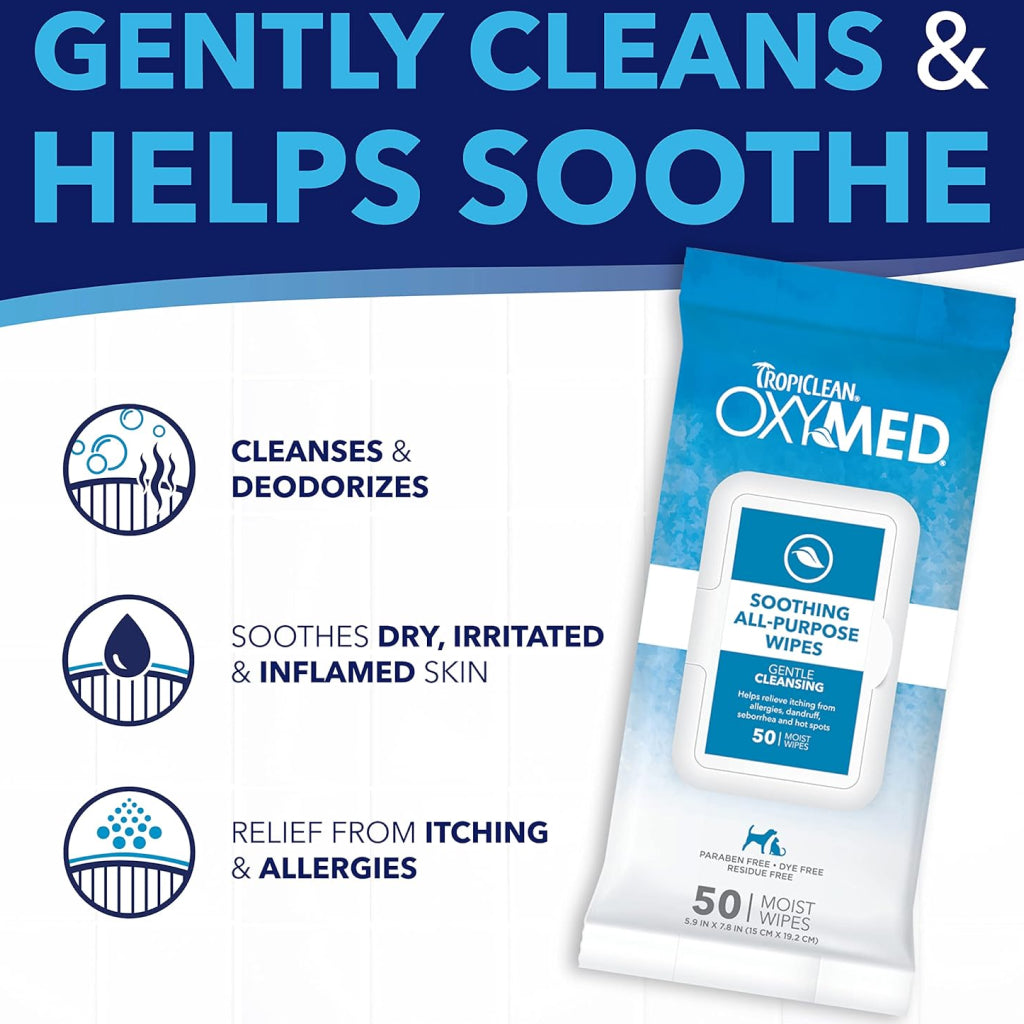 TropiClean Oxymed Soothing Relief Wipes for Pets provide gentle relief for your pet’s irritated skin. These wipes are formulated with soothing ingredients that help reduce itching and inflammation, promoting healthier, more comfortable skin. Ideal for sensitive skin, they are safe for dogs and cats of all sizes.