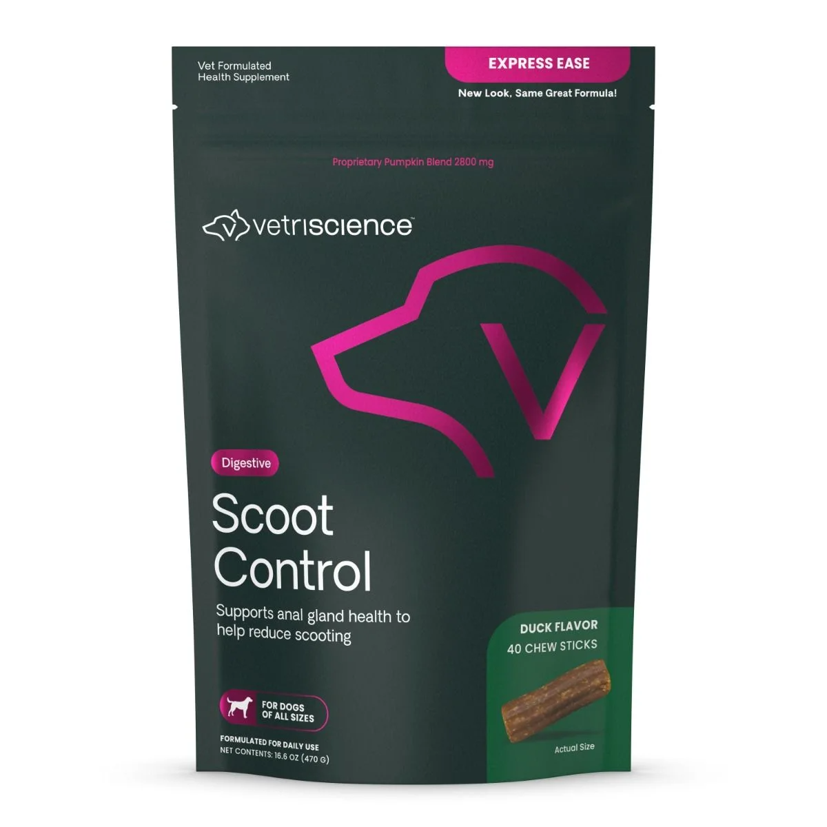 VetriScience Express Ease is recommended to support proper stool consistency for anal gland health which may help stop "scooting" dogs. Unlike canned pumpkin or pumpkin treats, Express Ease provides immune, digestive and colonic support. These tasty duck-flavored chewable bars do not contain added wheat while providing two grams of fiber to support anal gland health.
